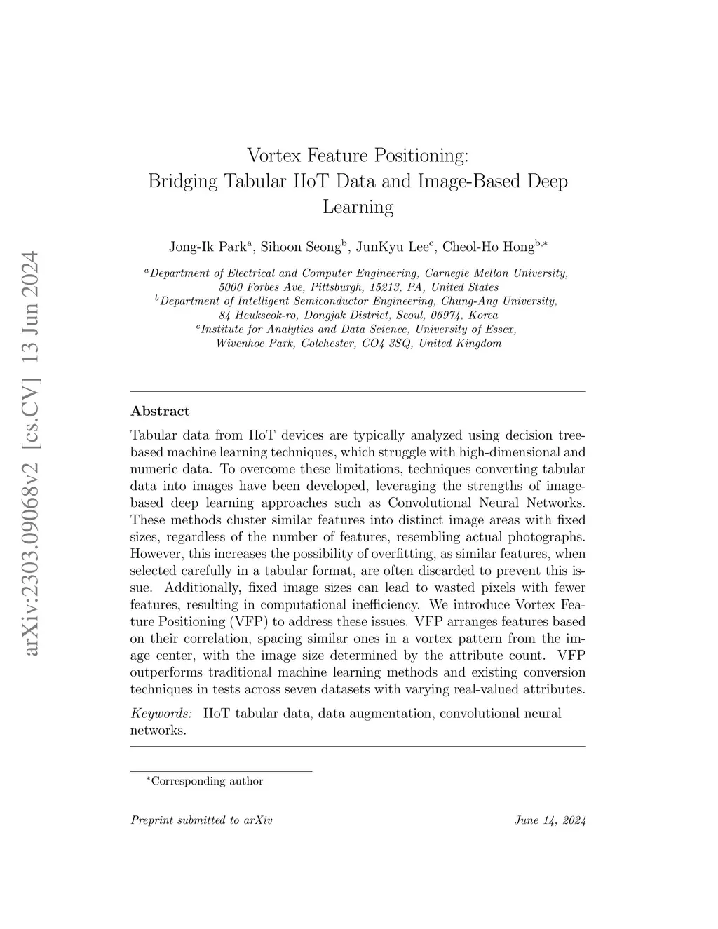 Tabular data from IIoT devices are typically analyzed using decision tree-based machine learning techniques, which struggle with high-dimensional and numeric data. To overcome these limitations, techniques converting tabular data into images have been developed, leveraging the strengths of image-based deep learning approaches such as Convolutional Neural Networks. These methods cluster similar features into distinct image areas with fixed sizes, regardless of the number of features, resembling actual photographs. However, this increases the possibility of overfitting, as similar features, when selected carefully in a tabular format, are often discarded to prevent this issue. Additionally, fixed image sizes can lead to wasted pixels with fewer features, resulting in computational inefficiency. We introduce Vortex Feature Positioning (VFP) to address these issues. VFP arranges features based on their correlation, spacing similar ones in a vortex pattern from the image center, with the image size determined by the attribute count. VFP outperforms traditional machine learning methods and existing conversion techniques in tests across seven datasets with varying real-valued attributes.