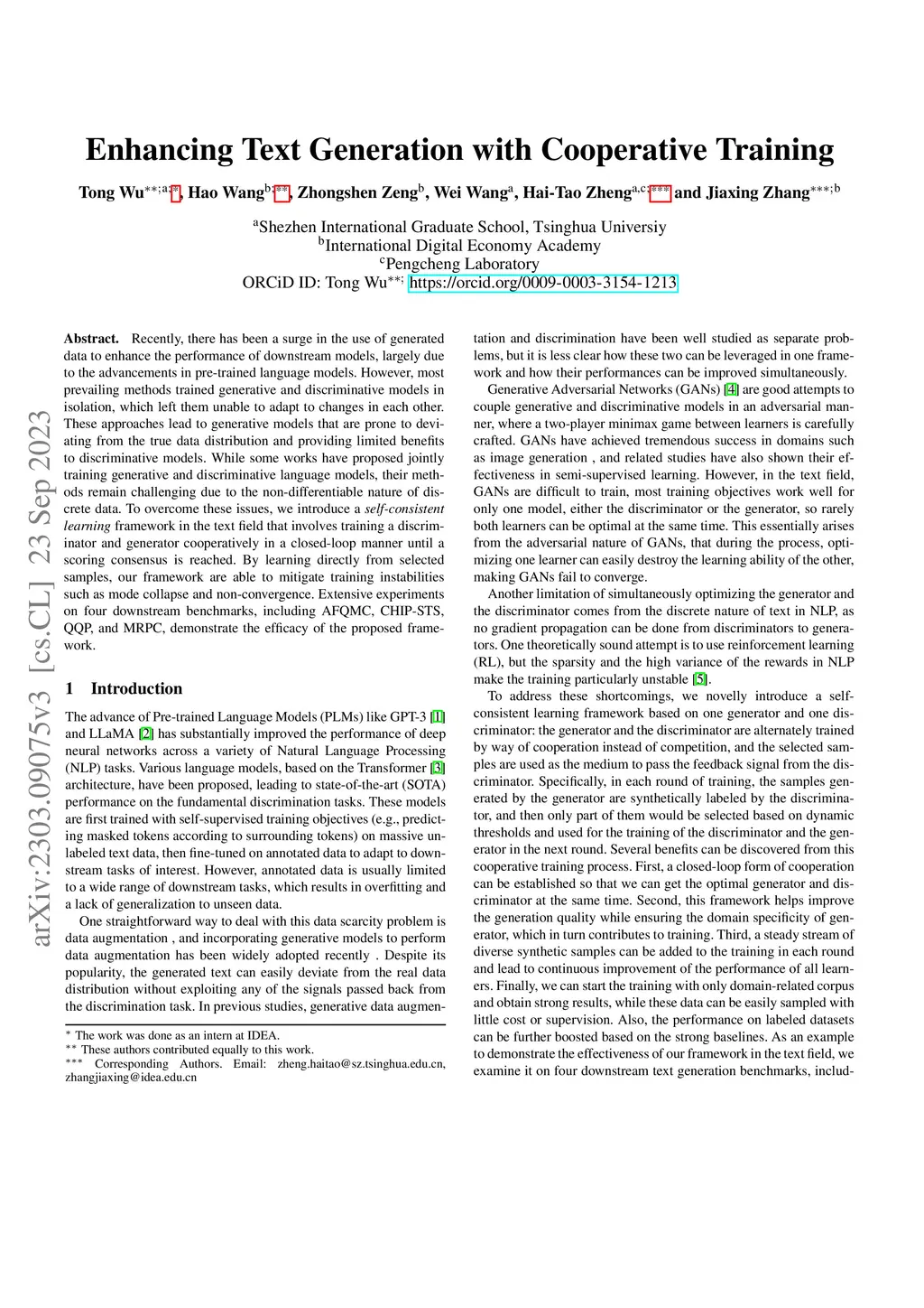 Recently, there has been a surge in the use of generated data to enhance the performance of downstream models, largely due to the advancements in pre-trained language models. However, most prevailing methods trained generative and discriminative models in isolation, which left them unable to adapt to changes in each other. These approaches lead to generative models that are prone to deviating from the true data distribution and providing limited benefits to discriminative models. While some works have proposed jointly training generative and discriminative language models, their methods remain challenging due to the non-differentiable nature of discrete data. To overcome these issues, we introduce a \textit{self-consistent learning} framework in the text field that involves training a discriminator and generator cooperatively in a closed-loop manner until a scoring consensus is reached. By learning directly from selected samples, our framework are able to mitigate training instabilities such as mode collapse and non-convergence. Extensive experiments on four downstream benchmarks, including AFQMC, CHIP-STS, QQP, and MRPC, demonstrate the efficacy of the proposed framework.