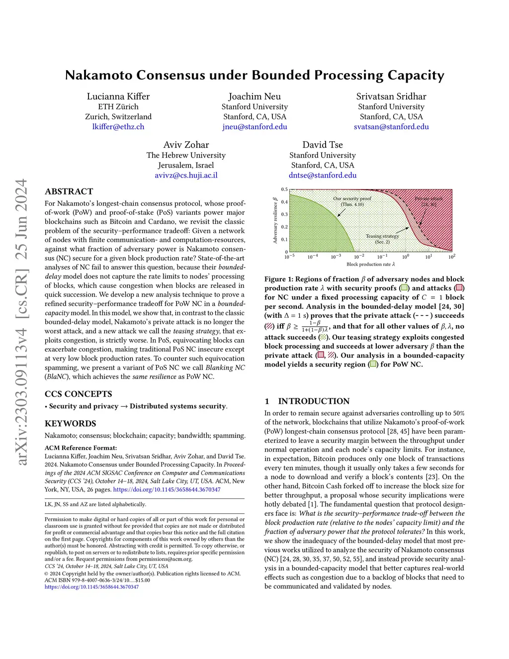 For Nakamoto's longest-chain consensus protocol, whose proof-of-work (PoW) and proof-of-stake (PoS) variants power major blockchains such as Bitcoin and Cardano, we revisit the classic problem of the security-performance tradeoff: Given a network of nodes with finite communication- and computation-resources, against what fraction of adversary power is Nakamoto consensus (NC) secure for a given block production rate? State-of-the-art analyses of NC fail to answer this question, because their bounded-delay model does not capture the rate limits to nodes' processing of blocks, which cause congestion when blocks are released in quick succession. We develop a new analysis technique to prove a refined security-performance tradeoff for PoW NC in a bounded-capacity model. In this model, we show that, in contrast to the classic bounded-delay model, Nakamoto's private attack is no longer the worst attack, and a new attack we call the teasing strategy, that exploits congestion, is strictly worse. In PoS, equivocating blocks can exacerbate congestion, making traditional PoS NC insecure except at very low block production rates. To counter such equivocation spamming, we present a variant of PoS NC we call Blanking NC (BlaNC), which achieves the same resilience as PoW NC.