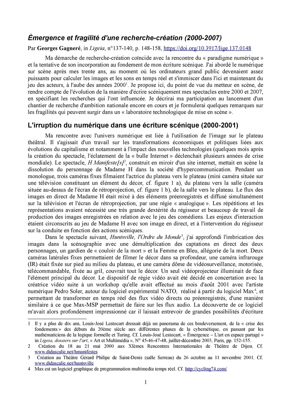 My research-creation process coincides with the encounter with the ''digital paradigm'' and the attempt to incorporate it into the foundation of my scenic writing. I propose in this paper to give an account from a director point of view of how I realized my shows between 2000 and 2007 and which researches influenced the process. I will formulate some remarks on the fragilities that can arise in a ''technological laboratory of staging''.