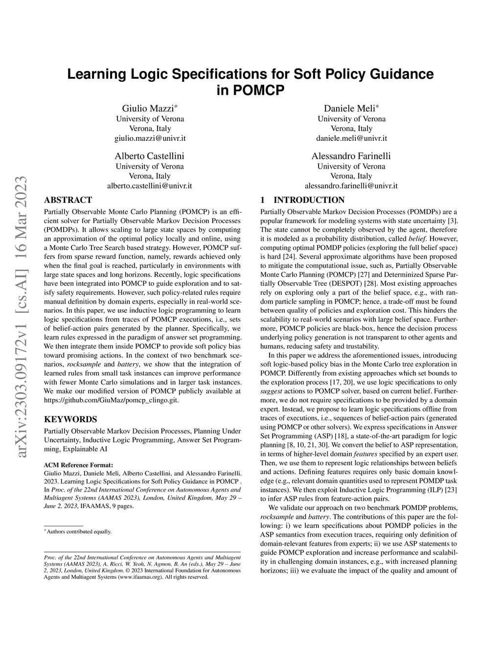 Partially Observable Monte Carlo Planning (POMCP) is an efficient solver for Partially Observable Markov Decision Processes (POMDPs). It allows scaling to large state spaces by computing an approximation of the optimal policy locally and online, using a Monte Carlo Tree Search based strategy. However, POMCP suffers from sparse reward function, namely, rewards achieved only when the final goal is reached, particularly in environments with large state spaces and long horizons. Recently, logic specifications have been integrated into POMCP to guide exploration and to satisfy safety requirements. However, such policy-related rules require manual definition by domain experts, especially in real-world scenarios. In this paper, we use inductive logic programming to learn logic specifications from traces of POMCP executions, i.e., sets of belief-action pairs generated by the planner. Specifically, we learn rules expressed in the paradigm of answer set programming. We then integrate them inside POMCP to provide soft policy bias toward promising actions. In the context of two benchmark scenarios, rocksample and battery, we show that the integration of learned rules from small task instances can improve performance with fewer Monte Carlo simulations and in larger task instances. We make our modified version of POMCP publicly available at https://github.com/GiuMaz/pomcp_clingo.git.