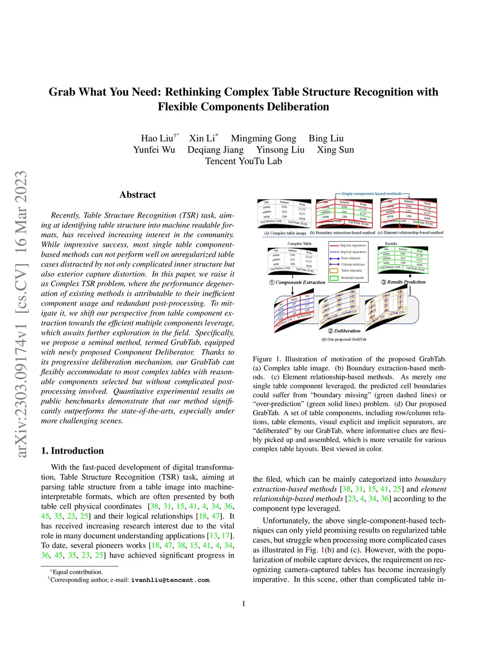 Recently, Table Structure Recognition (TSR) task, aiming at identifying table structure into machine readable formats, has received increasing interest in the community. While impressive success, most single table component-based methods can not perform well on unregularized table cases distracted by not only complicated inner structure but also exterior capture distortion. In this paper, we raise it as Complex TSR problem, where the performance degeneration of existing methods is attributable to their inefficient component usage and redundant post-processing. To mitigate it, we shift our perspective from table component extraction towards the efficient multiple components leverage, which awaits further exploration in the field. Specifically, we propose a seminal method, termed GrabTab, equipped with newly proposed Component Deliberator. Thanks to its progressive deliberation mechanism, our GrabTab can flexibly accommodate to most complex tables with reasonable components selected but without complicated post-processing involved. Quantitative experimental results on public benchmarks demonstrate that our method significantly outperforms the state-of-the-arts, especially under more challenging scenes.