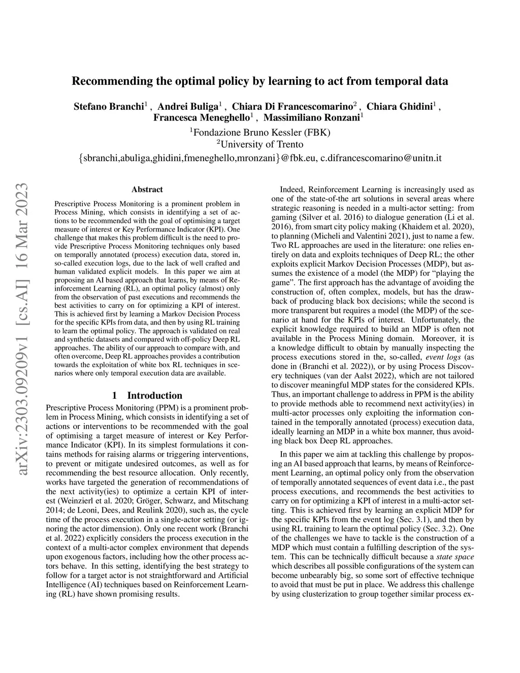 Prescriptive Process Monitoring is a prominent problem in Process Mining, which consists in identifying a set of actions to be recommended with the goal of optimising a target measure of interest or Key Performance Indicator (KPI). One challenge that makes this problem difficult is the need to provide Prescriptive Process Monitoring techniques only based on temporally annotated (process) execution data, stored in, so-called execution logs, due to the lack of well crafted and human validated explicit models. In this paper we aim at proposing an AI based approach that learns, by means of Reinforcement Learning (RL), an optimal policy (almost) only from the observation of past executions and recommends the best activities to carry on for optimizing a KPI of interest. This is achieved first by learning a Markov Decision Process for the specific KPIs from data, and then by using RL training to learn the optimal policy. The approach is validated on real and synthetic datasets and compared with off-policy Deep RL approaches. The ability of our approach to compare with, and often overcome, Deep RL approaches provides a contribution towards the exploitation of white box RL techniques in scenarios where only temporal execution data are available.