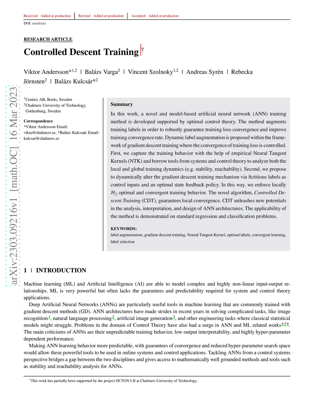 In this work, a novel and model-based artificial neural network (ANN) training method is developed supported by optimal control theory. The method augments training labels in order to robustly guarantee training loss convergence and improve training convergence rate. Dynamic label augmentation is proposed within the framework of gradient descent training where the convergence of training loss is controlled. First, we capture the training behavior with the help of empirical Neural Tangent Kernels (NTK) and borrow tools from systems and control theory to analyze both the local and global training dynamics (e.g. stability, reachability). Second, we propose to dynamically alter the gradient descent training mechanism via fictitious labels as control inputs and an optimal state feedback policy. In this way, we enforce locally optimal and convergent training behavior. The novel algorithm, \textit{Controlled Descent Training} (CDT), guarantees local convergence. CDT unleashes new potentials in the analysis, interpretation, and design of ANN architectures. The applicability of the method is demonstrated on standard regression and classification problems.