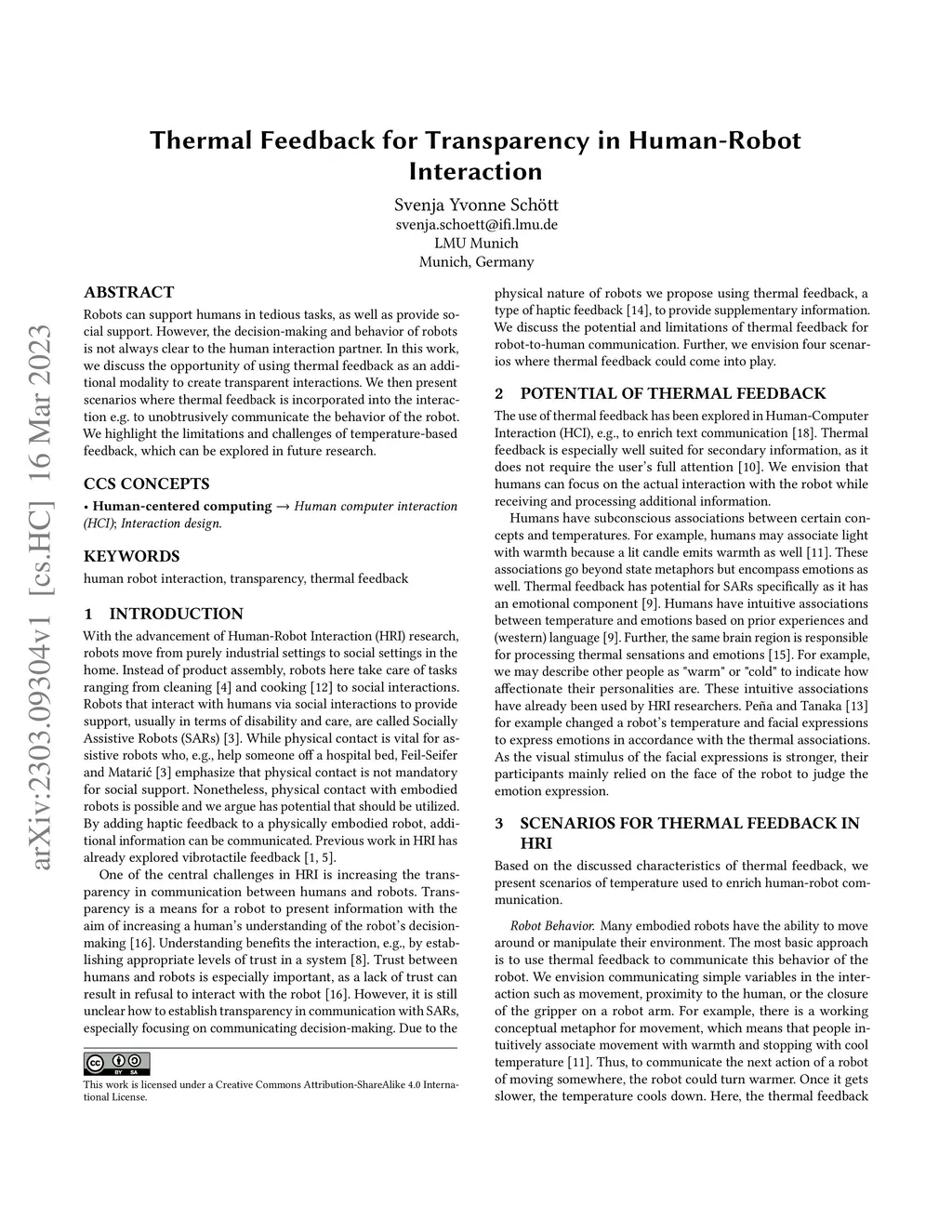 Robots can support humans in tedious tasks, as well as provide social support. However, the decision-making and behavior of robots is not always clear to the human interaction partner. In this work, we discuss the opportunity of using thermal feedback as an additional modality to create transparent interactions. We then present scenarios where thermal feedback is incorporated into the interaction e.g. to unobtrusively communicate the behavior of the robot. We highlight the limitations and challenges of temperature-based feedback, which can be explored in future research.