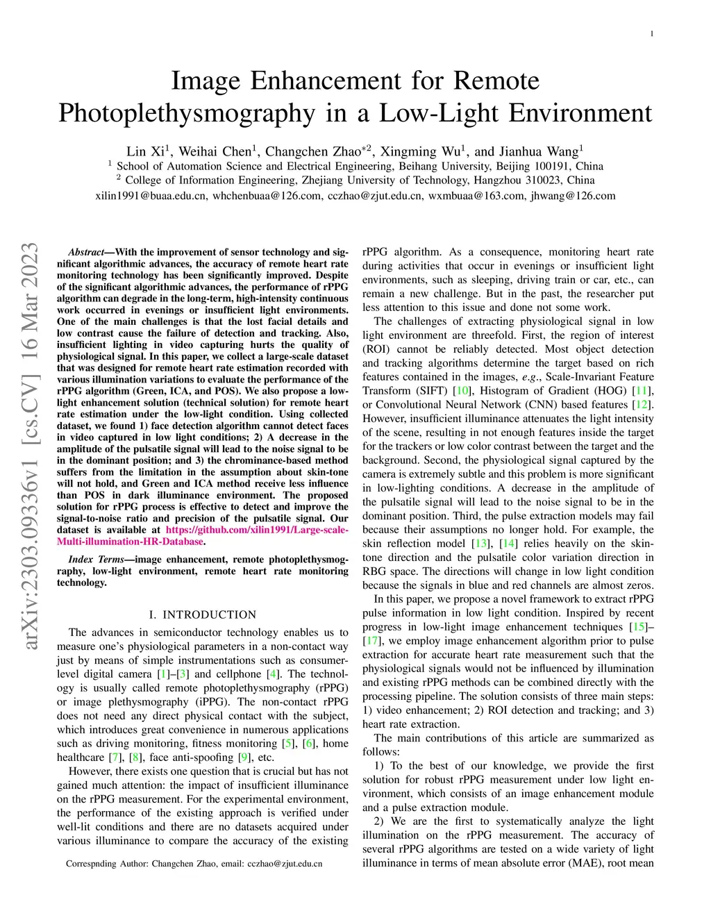 With the improvement of sensor technology and significant algorithmic advances, the accuracy of remote heart rate monitoring technology has been significantly improved. Despite of the significant algorithmic advances, the performance of rPPG algorithm can degrade in the long-term, high-intensity continuous work occurred in evenings or insufficient light environments. One of the main challenges is that the lost facial details and low contrast cause the failure of detection and tracking. Also, insufficient lighting in video capturing hurts the quality of physiological signal. In this paper, we collect a large-scale dataset that was designed for remote heart rate estimation recorded with various illumination variations to evaluate the performance of the rPPG algorithm (Green, ICA, and POS). We also propose a low-light enhancement solution (technical solution) for remote heart rate estimation under the low-light condition. Using collected dataset, we found 1) face detection algorithm cannot detect faces in video captured in low light conditions; 2) A decrease in the amplitude of the pulsatile signal will lead to the noise signal to be in the dominant position; and 3) the chrominance-based method suffers from the limitation in the assumption about skin-tone will not hold, and Green and ICA method receive less influence than POS in dark illuminance environment. The proposed solution for rPPG process is effective to detect and improve the signal-to-noise ratio and precision of the pulsatile signal.
