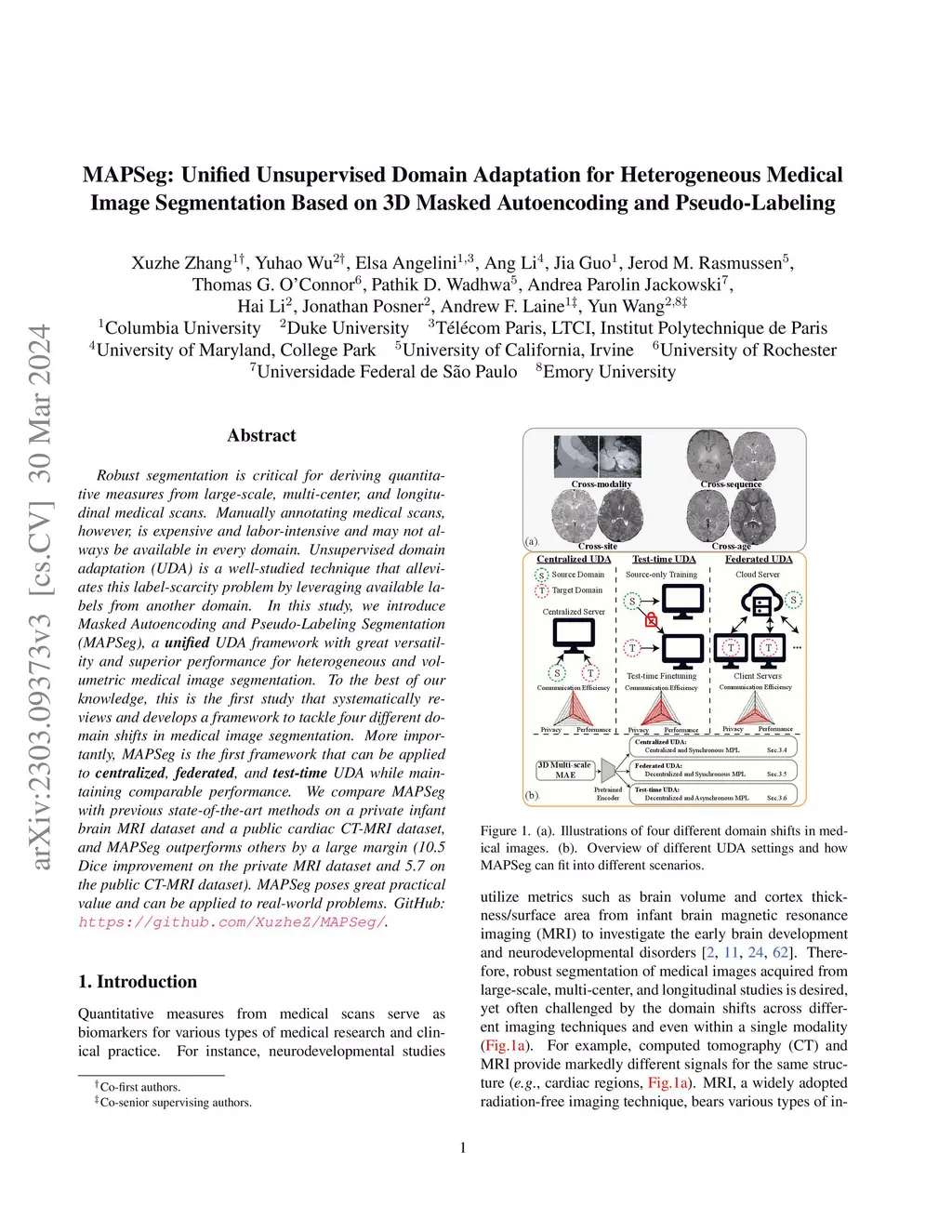 Robust segmentation is critical for deriving quantitative measures from large-scale, multi-center, and longitudinal medical scans. Manually annotating medical scans, however, is expensive and labor-intensive and may not always be available in every domain. Unsupervised domain adaptation (UDA) is a well-studied technique that alleviates this label-scarcity problem by leveraging available labels from another domain. In this study, we introduce Masked Autoencoding and Pseudo-Labeling Segmentation (MAPSeg), a UDA framework with great versatility and superior performance for heterogeneous and volumetric medical image segmentation. To the best of our knowledge, this is the first study that systematically reviews and develops a framework to tackle four different domain shifts in medical image segmentation. More importantly, MAPSeg is the first framework that can be applied to , , and UDA while maintaining comparable performance. We compare MAPSeg with previous state-of-the-art methods on a private infant brain MRI dataset and a public cardiac CT-MRI dataset, and MAPSeg outperforms others by a large margin (10.5 Dice improvement on the private MRI dataset and 5.7 on the public CT-MRI dataset). MAPSeg poses great practical value and can be applied to real-world problems. GitHub: https://github.com/XuzheZ/MAPSeg/.