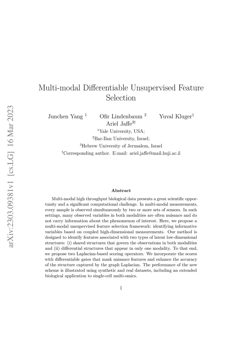 Multi-modal high throughput biological data presents a great scientific opportunity and a significant computational challenge. In multi-modal measurements, every sample is observed simultaneously by two or more sets of sensors. In such settings, many observed variables in both modalities are often nuisance and do not carry information about the phenomenon of interest. Here, we propose a multi-modal unsupervised feature selection framework: identifying informative variables based on coupled high-dimensional measurements. Our method is designed to identify features associated with two types of latent low-dimensional structures: (i) shared structures that govern the observations in both modalities and (ii) differential structures that appear in only one modality. To that end, we propose two Laplacian-based scoring operators. We incorporate the scores with differentiable gates that mask nuisance features and enhance the accuracy of the structure captured by the graph Laplacian. The performance of the new scheme is illustrated using synthetic and real datasets, including an extended biological application to single-cell multi-omics.