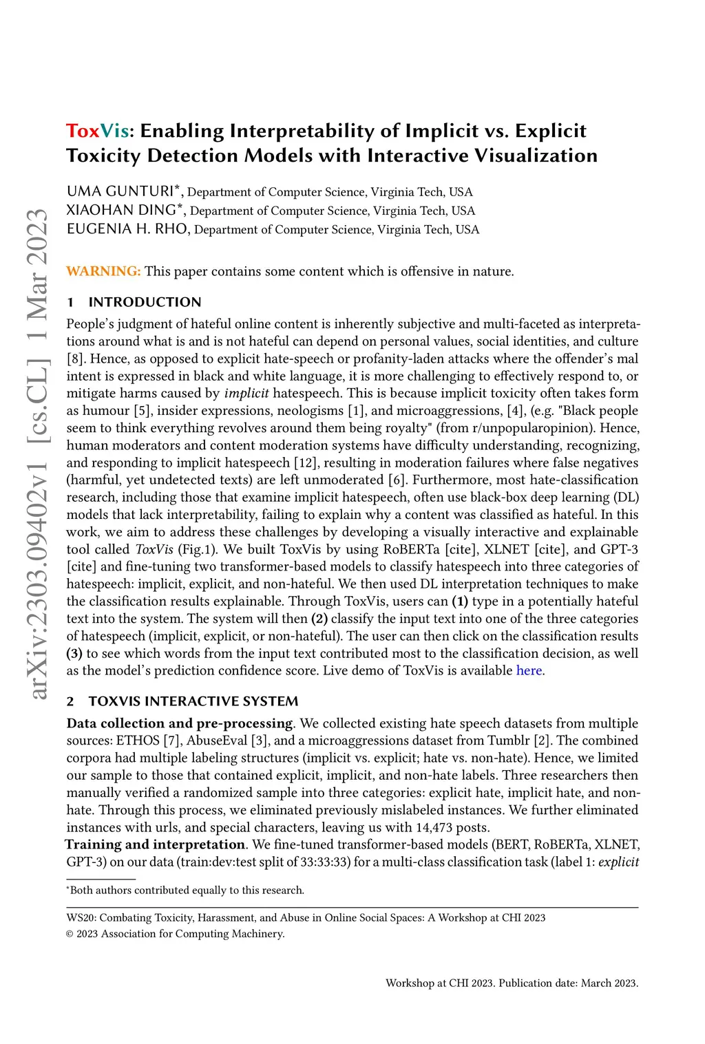 The rise of hate speech on online platforms has led to an urgent need for effective content moderation. However, the subjective and multi-faceted nature of hateful online content, including implicit hate speech, poses significant challenges to human moderators and content moderation systems. To address this issue, we developed ToxVis, a visually interactive and explainable tool for classifying hate speech into three categories: implicit, explicit, and non-hateful. We fine-tuned two transformer-based models using RoBERTa, XLNET, and GPT-3 and used deep learning interpretation techniques to provide explanations for the classification results. ToxVis enables users to input potentially hateful text and receive a classification result along with a visual explanation of which words contributed most to the decision. By making the classification process explainable, ToxVis provides a valuable tool for understanding the nuances of hateful content and supporting more effective content moderation. Our research contributes to the growing body of work aimed at mitigating the harms caused by online hate speech and demonstrates the potential for combining state-of-the-art natural language processing models with interpretable deep learning techniques to address this critical issue. Finally, ToxVis can serve as a resource for content moderators, social media platforms, and researchers working to combat the spread of hate speech online.