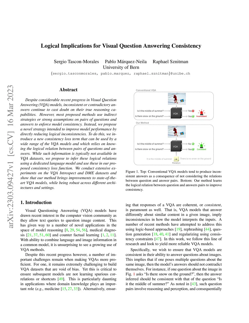 Despite considerable recent progress in Visual Question Answering (VQA) models, inconsistent or contradictory answers continue to cast doubt on their true reasoning capabilities. However, most proposed methods use indirect strategies or strong assumptions on pairs of questions and answers to enforce model consistency. Instead, we propose a novel strategy intended to improve model performance by directly reducing logical inconsistencies. To do this, we introduce a new consistency loss term that can be used by a wide range of the VQA models and which relies on knowing the logical relation between pairs of questions and answers. While such information is typically not available in VQA datasets, we propose to infer these logical relations using a dedicated language model and use these in our proposed consistency loss function. We conduct extensive experiments on the VQA Introspect and DME datasets and show that our method brings improvements to state-of-the-art VQA models, while being robust across different architectures and settings.