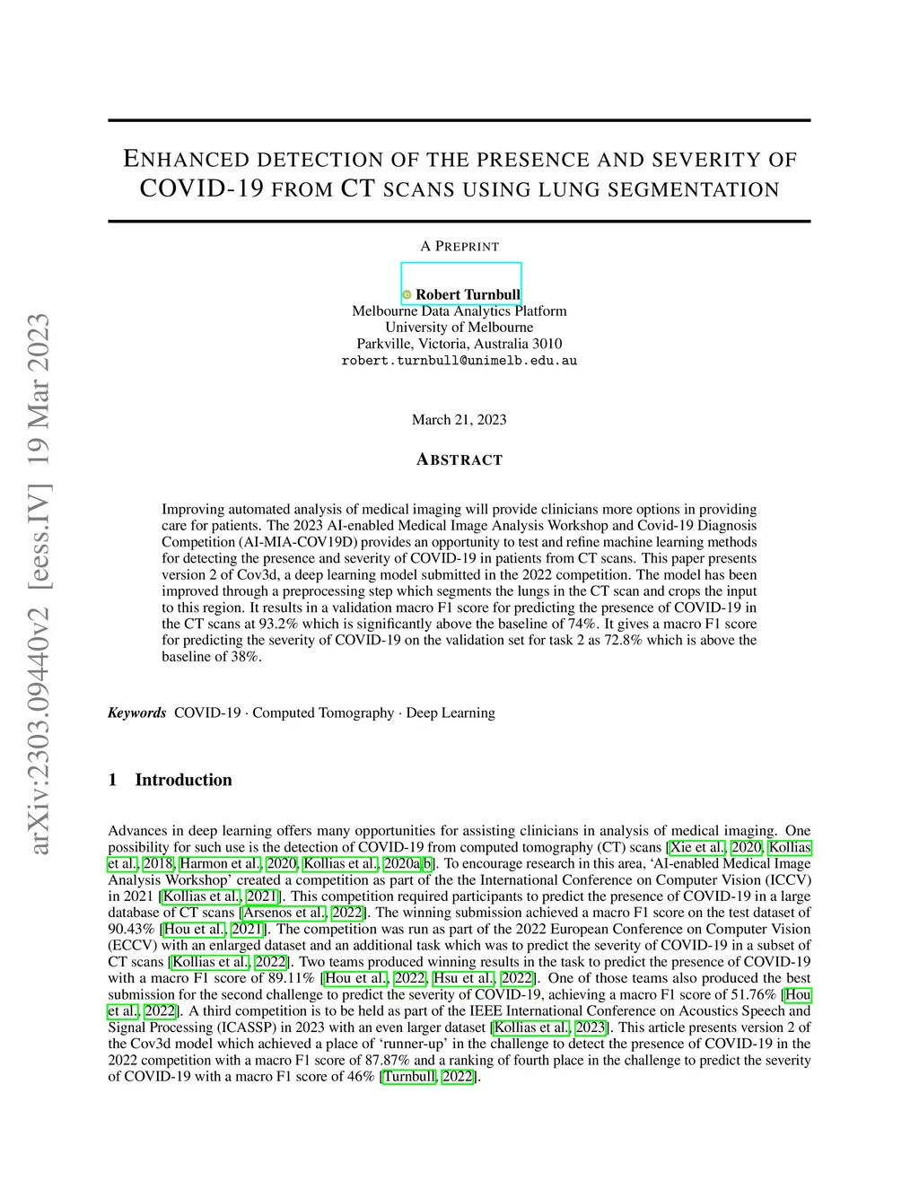 Improving automated analysis of medical imaging will provide clinicians more options in providing care for patients. The 2023 AI-enabled Medical Image Analysis Workshop and Covid-19 Diagnosis Competition (AI-MIA-COV19D) provides an opportunity to test and refine machine learning methods for detecting the presence and severity of COVID-19 in patients from CT scans. This paper presents version 2 of Cov3d, a deep learning model submitted in the 2022 competition. The model has been improved through a preprocessing step which segments the lungs in the CT scan and crops the input to this region. It results in a validation macro F1 score for predicting the presence of COVID-19 in the CT scans at 93.2% which is significantly above the baseline of 74\%. It gives a macro F1 score for predicting the severity of COVID-19 on the validation set for task 2 as 72.8% which is above the baseline of 38%.