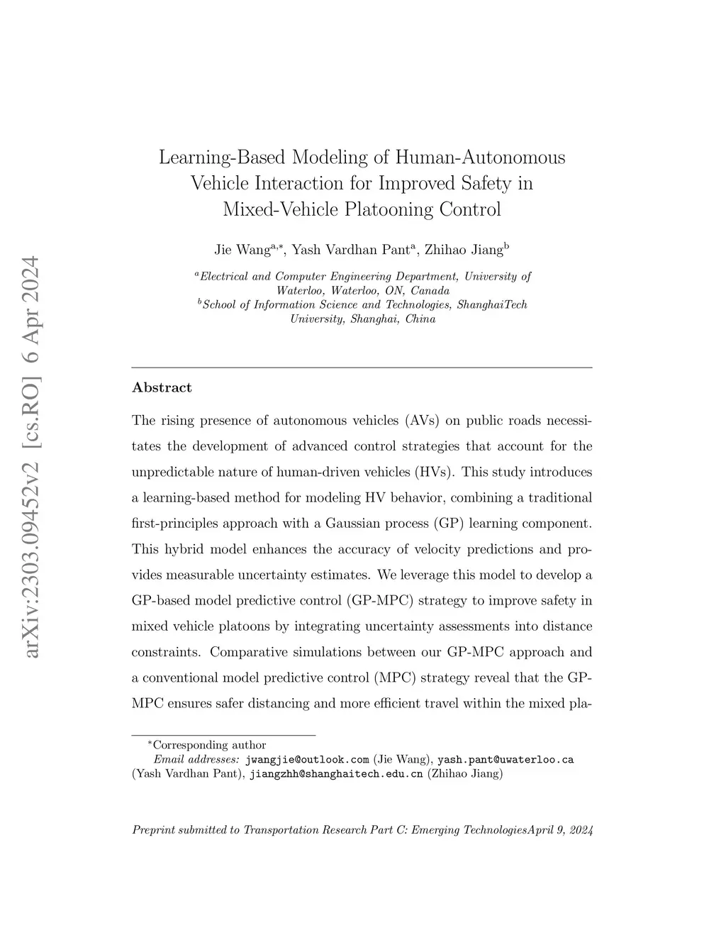 The rising presence of autonomous vehicles (AVs) on public roads necessitates the development of advanced control strategies that account for the unpredictable nature of human-driven vehicles (HVs). This study introduces a learning-based method for modeling HV behavior, combining a traditional first-principles approach with a Gaussian process (GP) learning component. This hybrid model enhances the accuracy of velocity predictions and provides measurable uncertainty estimates. We leverage this model to develop a GP-based model predictive control (GP-MPC) strategy to improve safety in mixed vehicle platoons by integrating uncertainty assessments into distance constraints. Comparative simulations between our GP-MPC approach and a conventional model predictive control (MPC) strategy reveal that the GP-MPC ensures safer distancing and more efficient travel within the mixed platoon. By incorporating sparse GP modeling for HVs and a dynamic GP prediction in MPC, we significantly reduce the computation time of GP-MPC, making it only marginally longer than standard MPC and approximately 100 times faster than previous models not employing these techniques. Our findings underscore the effectiveness of learning-based HV modeling in enhancing safety and efficiency in mixed-traffic environments involving AV and HV interactions.