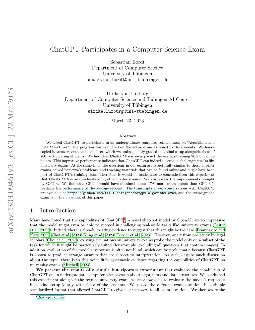 We asked ChatGPT to participate in an undergraduate computer science exam on 'Álgorithms and Data Structures''. The program was evaluated on the entire exam as posed to the students. We hand-copied its answers onto an exam sheet, which was subsequently graded in a blind setup alongside those of 200 participating students. We find that ChatGPT narrowly passed the exam, obtaining 20.5 out of 40 points. This impressive performance indicates that ChatGPT can indeed succeed in challenging tasks like university exams. At the same time, the questions in our exam are structurally similar to those of other exams, solved homework problems, and teaching materials that can be found online and might have been part of ChatGPT's training data. Therefore, it would be inadequate to conclude from this experiment that ChatGPT has any understanding of computer science. We also assess the improvements brought by GPT-4. We find that GPT-4 would have obtained about 17\% more exam points than GPT-3.5, reaching the performance of the average student. The transcripts of our conversations with ChatGPT are available at \url{https://github.com/tml-tuebingen/chatgpt-algorithm-exam}, and the entire graded exam is in the appendix of this paper.