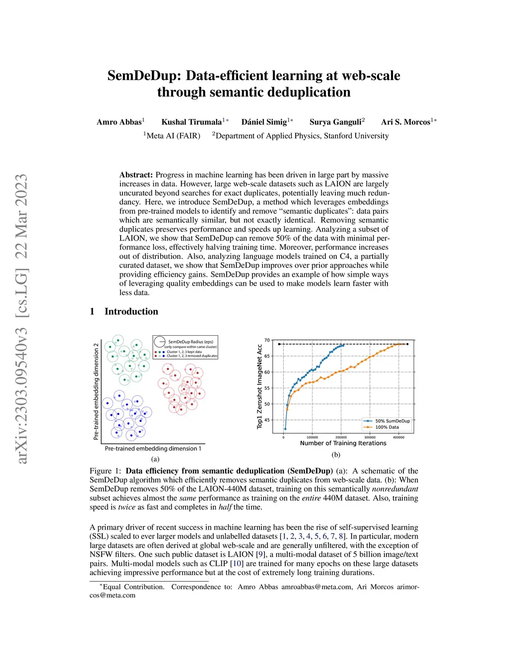 SemDeDup: Data-efficient learning at web-scale through semantic