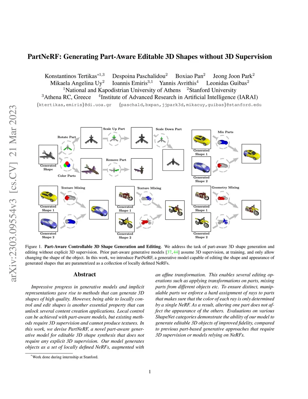 Impressive progress in generative models and implicit representations gave rise to methods that can generate 3D shapes of high quality. However, being able to locally control and edit shapes is another essential property that can unlock several content creation applications. Local control can be achieved with part-aware models, but existing methods require 3D supervision and cannot produce textures. In this work, we devise PartNeRF, a novel part-aware generative model for editable 3D shape synthesis that does not require any explicit 3D supervision. Our model generates objects as a set of locally defined NeRFs, augmented with an affine transformation. This enables several editing operations such as applying transformations on parts, mixing parts from different objects etc. To ensure distinct, manipulable parts we enforce a hard assignment of rays to parts that makes sure that the color of each ray is only determined by a single NeRF. As a result, altering one part does not affect the appearance of the others. Evaluations on various ShapeNet categories demonstrate the ability of our model to generate editable 3D objects of improved fidelity, compared to previous part-based generative approaches that require 3D supervision or models relying on NeRFs.