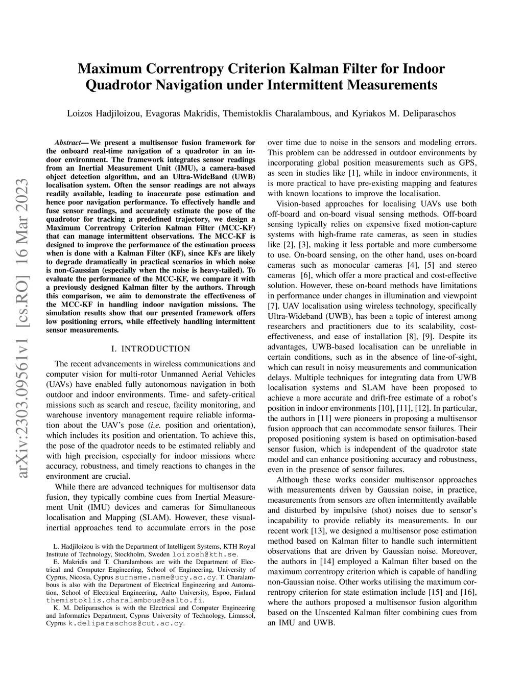 We present a multisensor fusion framework for the onboard real-time navigation of a quadrotor in an indoor environment. The framework integrates sensor readings from an Inertial Measurement Unit (IMU), a camera-based object detection algorithm, and an Ultra-WideBand (UWB) localisation system. Often the sensor readings are not always readily available, leading to inaccurate pose estimation and hence poor navigation performance. To effectively handle and fuse sensor readings, and accurately estimate the pose of the quadrotor for tracking a predefined trajectory, we design a Maximum Correntropy Criterion Kalman Filter (MCC-KF) that can manage intermittent observations. The MCC-KF is designed to improve the performance of the estimation process when is done with a Kalman Filter (KF), since KFs are likely to degrade dramatically in practical scenarios in which noise is non-Gaussian (especially when the noise is heavy-tailed). To evaluate the performance of the MCC-KF, we compare it with a previously designed Kalman filter by the authors. Through this comparison, we aim to demonstrate the effectiveness of the MCC-KF in handling indoor navigation missions. The simulation results show that our presented framework offers low positioning errors, while effectively handling intermittent sensor measurements.