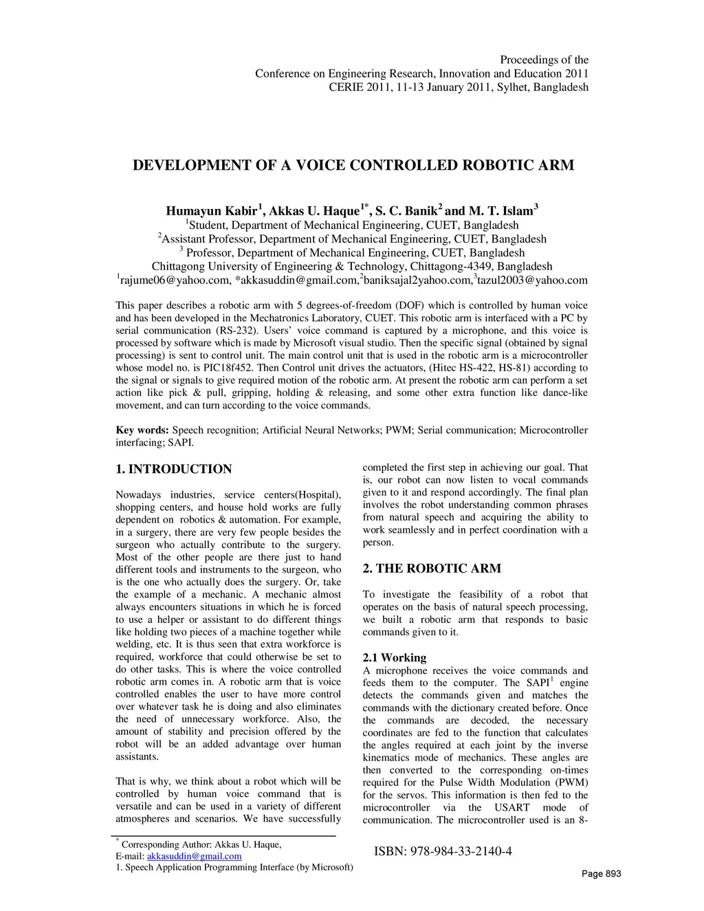 This paper describes a robotic arm with 5 degrees-of-freedom (DOF) which is controlled by human voice and has been developed in the Mechatronics Laboratory, CUET. This robotic arm is interfaced with a PC by serial communication (RS-232). Users' voice command is captured by a microphone, and this voice is processed by software which is made by Microsoft visual studio. Then the specific signal (obtained by signal processing) is sent to control unit. The main control unit that is used in the robotic arm is a microcontroller whose model no. is PIC18f452. Then Control unit drives the actuators, (Hitec HS-422, HS-81) according to the signal or signals to give required motion of the robotic arm. At present the robotic arm can perform a set action like pick & pull, gripping, holding & releasing, and some other extra function like dance-like movement, and can turn according to the voice commands.