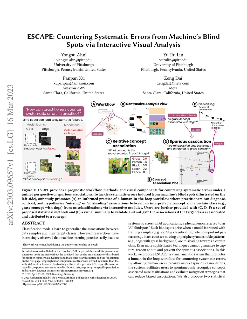 Classification models learn to generalize the associations between data samples and their target classes. However, researchers have increasingly observed that machine learning practice easily leads to systematic errors in AI applications, a phenomenon referred to as AI blindspots. Such blindspots arise when a model is trained with training samples (e.g., cat/dog classification) where important patterns (e.g., black cats) are missing or periphery/undesirable patterns (e.g., dogs with grass background) are misleading towards a certain class. Even more sophisticated techniques cannot guarantee to capture, reason about, and prevent the spurious associations. In this work, we propose ESCAPE, a visual analytic system that promotes a human-in-the-loop workflow for countering systematic errors. By allowing human users to easily inspect spurious associations, the system facilitates users to spontaneously recognize concepts associated misclassifications and evaluate mitigation strategies that can reduce biased associations. We also propose two statistical approaches, relative concept association to better quantify the associations between a concept and instances, and debias method to mitigate spurious associations. We demonstrate the utility of our proposed ESCAPE system and statistical measures through extensive evaluation including quantitative experiments, usage scenarios, expert interviews, and controlled user experiments.