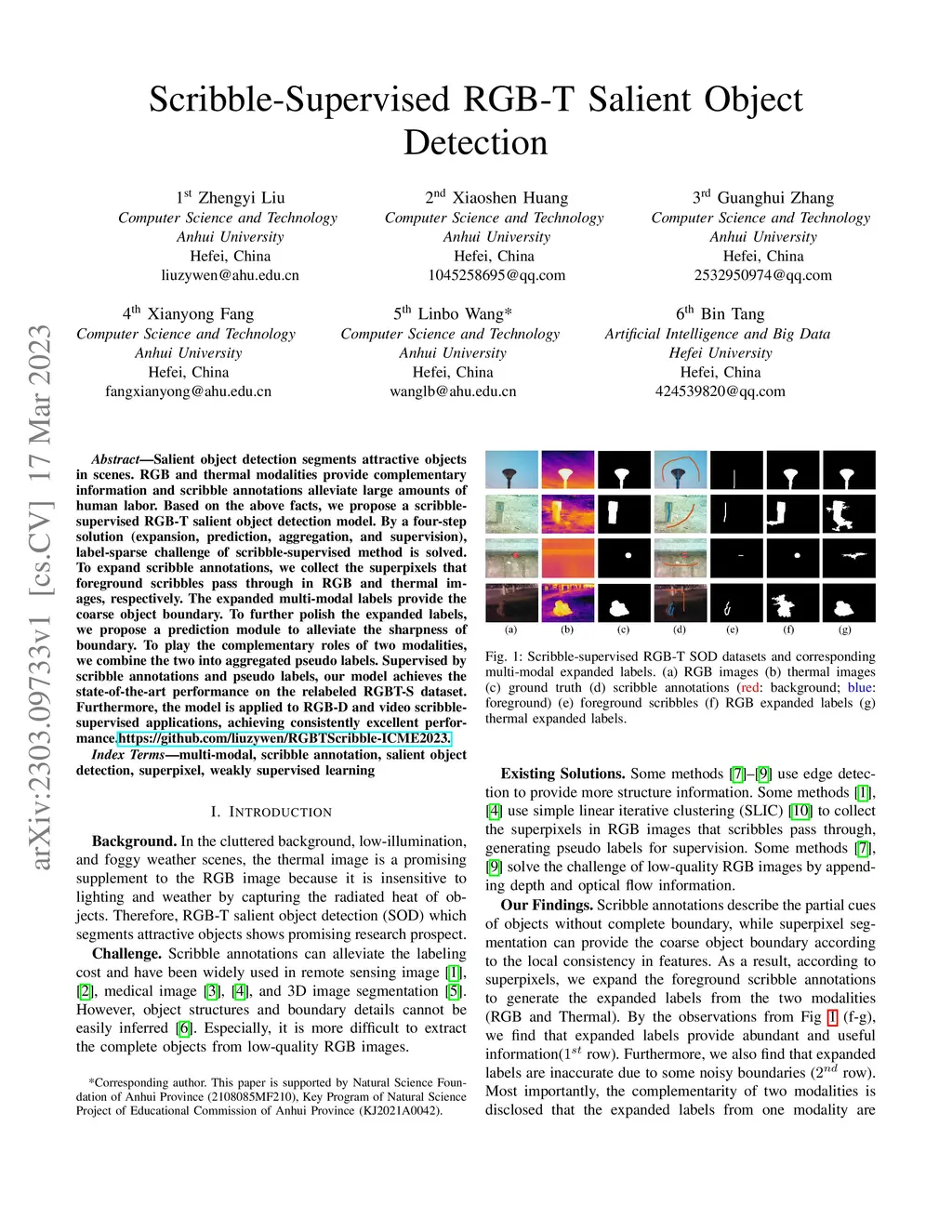 Salient object detection segments attractive objects in scenes. RGB and thermal modalities provide complementary information and scribble annotations alleviate large amounts of human labor. Based on the above facts, we propose a scribble-supervised RGB-T salient object detection model. By a four-step solution (expansion, prediction, aggregation, and supervision), label-sparse challenge of scribble-supervised method is solved. To expand scribble annotations, we collect the superpixels that foreground scribbles pass through in RGB and thermal images, respectively. The expanded multi-modal labels provide the coarse object boundary. To further polish the expanded labels, we propose a prediction module to alleviate the sharpness of boundary. To play the complementary roles of two modalities, we combine the two into aggregated pseudo labels. Supervised by scribble annotations and pseudo labels, our model achieves the state-of-the-art performance on the relabeled RGBT-S dataset. Furthermore, the model is applied to RGB-D and video scribble-supervised applications, achieving consistently excellent performance.
