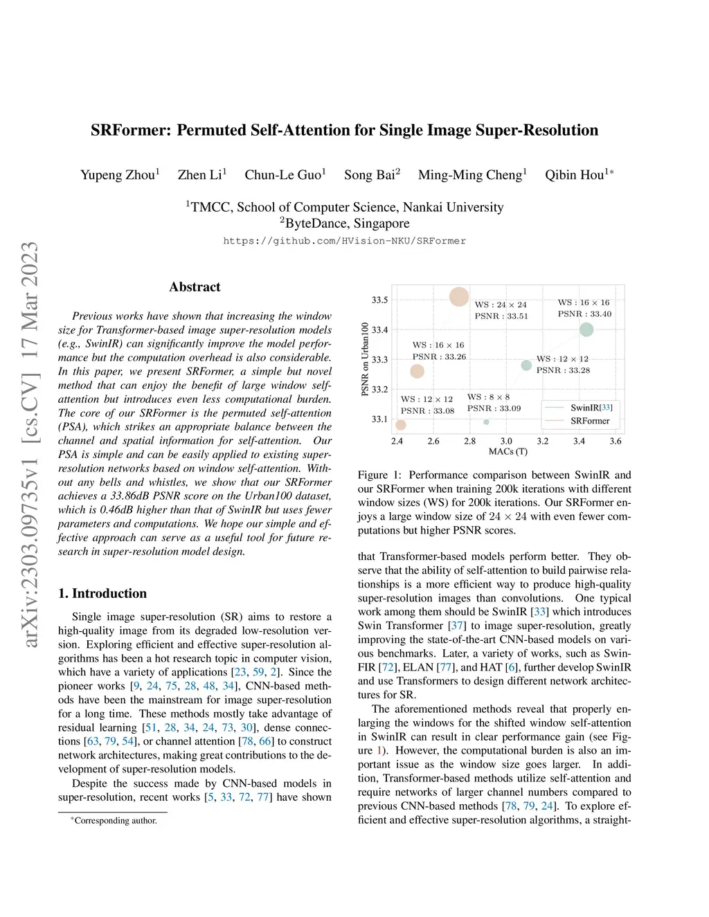 Previous works have shown that increasing the window size for Transformer-based image super-resolution models (e.g., SwinIR) can significantly improve the model performance but the computation overhead is also considerable. In this paper, we present SRFormer, a simple but novel method that can enjoy the benefit of large window self-attention but introduces even less computational burden. The core of our SRFormer is the permuted self-attention (PSA), which strikes an appropriate balance between the channel and spatial information for self-attention. Our PSA is simple and can be easily applied to existing super-resolution networks based on window self-attention. Without any bells and whistles, we show that our SRFormer achieves a 33.86dB PSNR score on the Urban100 dataset, which is 0.46dB higher than that of SwinIR but uses fewer parameters and computations. We hope our simple and effective approach can serve as a useful tool for future research in super-resolution model design.