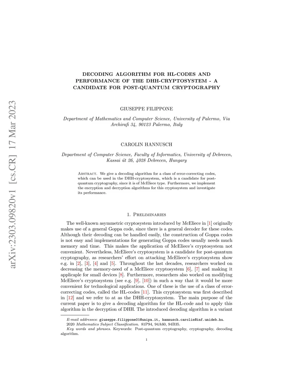We give a decoding algorithm for a class of error-correcting codes, which can be used in the DHH-cryptosystem, which is a candidate for post-quantum cryptography, since it is of McEliece type. Furthermore, we implement the encryption and decryption algorithms for this cryptosystem and investigate its performance.