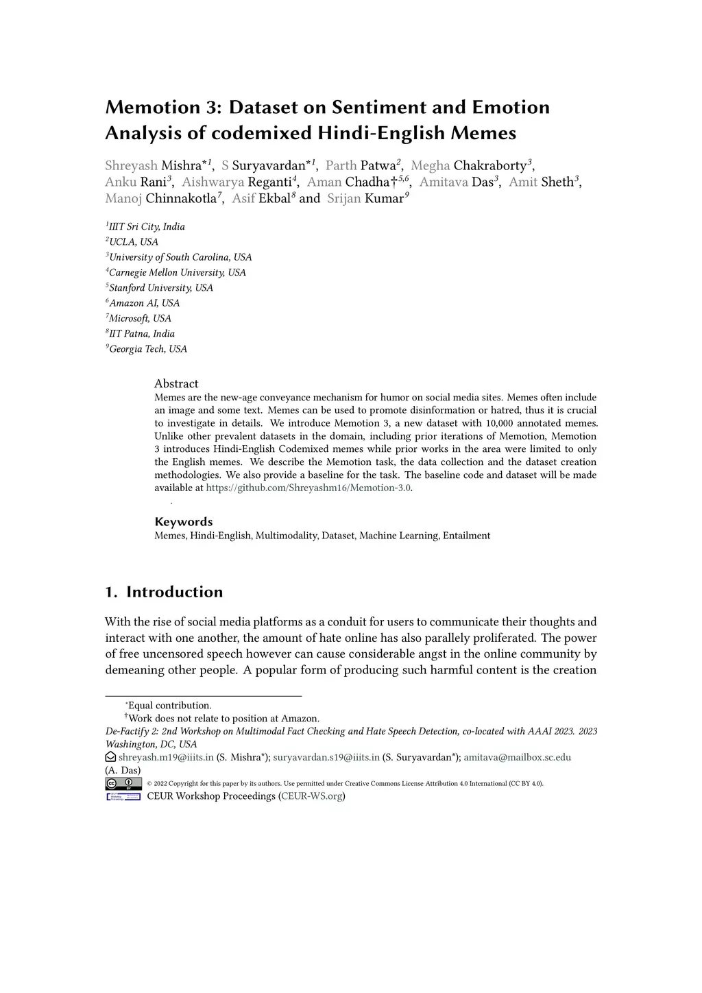 Memes are the new-age conveyance mechanism for humor on social media sites. Memes often include an image and some text. Memes can be used to promote disinformation or hatred, thus it is crucial to investigate in details. We introduce Memotion 3, a new dataset with 10,000 annotated memes. Unlike other prevalent datasets in the domain, including prior iterations of Memotion, Memotion 3 introduces Hindi-English Codemixed memes while prior works in the area were limited to only the English memes. We describe the Memotion task, the data collection and the dataset creation methodologies. We also provide a baseline for the task. The baseline code and dataset will be made available at https://github.com/Shreyashm16/Memotion-3.0