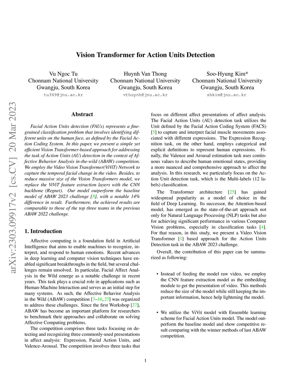 Facial Action Units detection (FAUs) represents a fine-grained classification problem that involves identifying different units on the human face, as defined by the Facial Action Coding System. In this paper, we present a simple yet efficient Vision Transformer-based approach for addressing the task of Action Units (AU) detection in the context of Affective Behavior Analysis in-the-wild (ABAW) competition. We employ the Video Vision Transformer(ViViT) Network to capture the temporal facial change in the video. Besides, to reduce massive size of the Vision Transformers model, we replace the ViViT feature extraction layers with the CNN backbone (Regnet). Our model outperform the baseline model of ABAW 2023 challenge, with a notable 14% difference in result. Furthermore, the achieved results are comparable to those of the top three teams in the previous ABAW 2022 challenge.