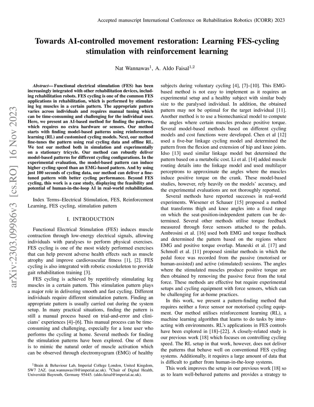 Towards AI-controlled FES-restoration of movements: Learning cycling