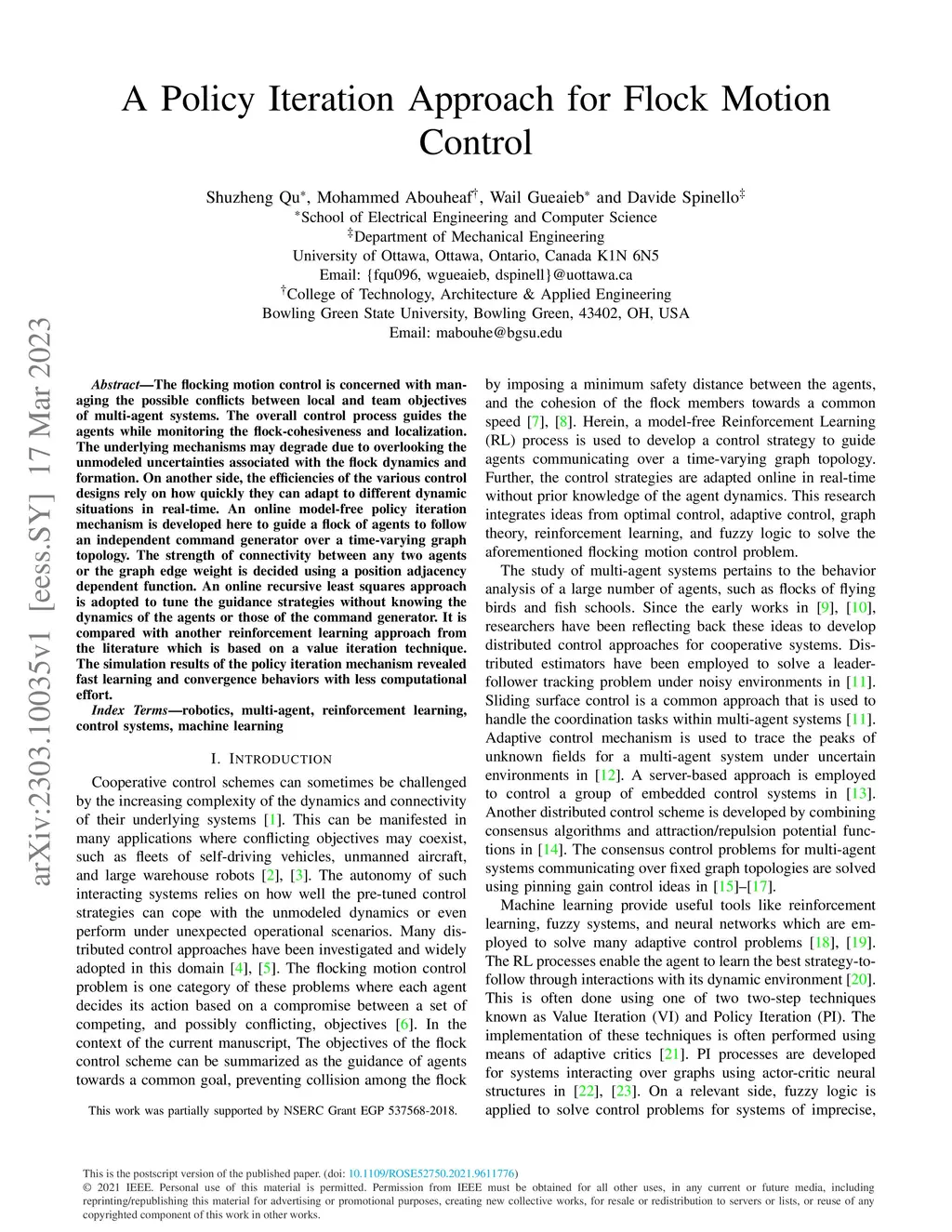 A Policy Iteration Approach for Flock Motion Control