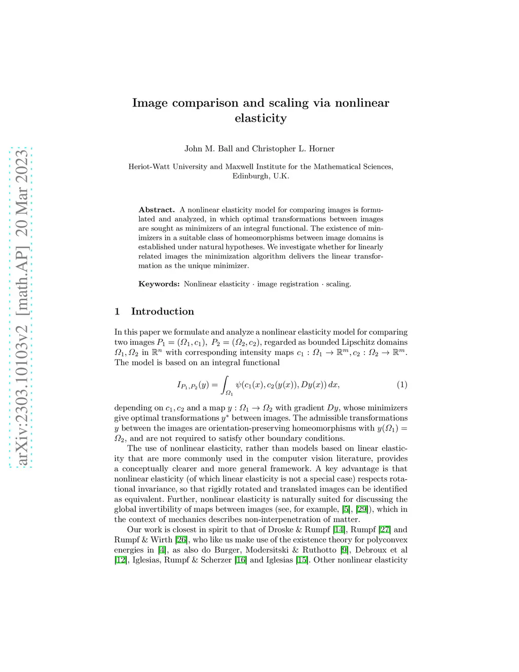 A nonlinear elasticity model for comparing images is formulated and analyzed, in which optimal transformations between images are sought as minimizers of an integral functional. The existence of minimizers in a suitable class of homeomorphisms between image domains is established under natural hypotheses. We investigate whether for linearly related images the minimization algorithm delivers the linear transformation as the unique minimizer.