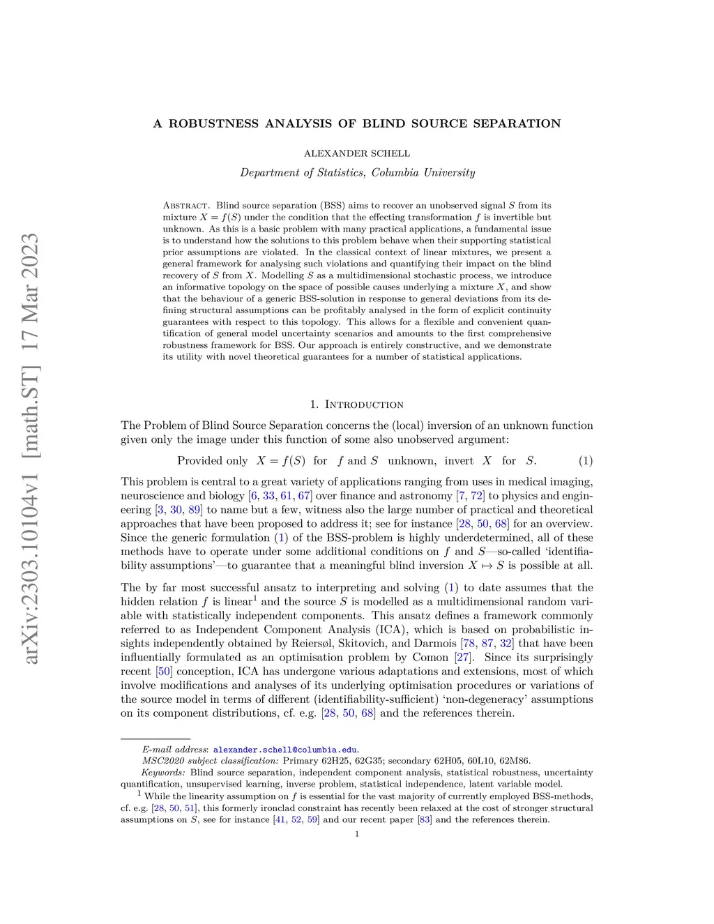 Blind source separation (BSS) aims to recover an unobserved signal from its mixture under the condition that the effecting transformation is invertible but unknown. As this is a basic problem with many practical applications, a fundamental issue is to understand how the solutions to this problem behave when their supporting statistical prior assumptions are violated. In the classical context of linear mixtures, we present a general framework for analysing such violations and quantifying their impact on the blind recovery of from . Modelling as a multidimensional stochastic process, we introduce an informative topology on the space of possible causes underlying a mixture , and show that the behaviour of a generic BSS-solution in response to general deviations from its defining structural assumptions can be profitably analysed in the form of explicit continuity guarantees with respect to this topology. This allows for a flexible and convenient quantification of general model uncertainty scenarios and amounts to the first comprehensive robustness framework for BSS. Our approach is entirely constructive, and we demonstrate its utility with novel theoretical guarantees for a number of statistical applications.