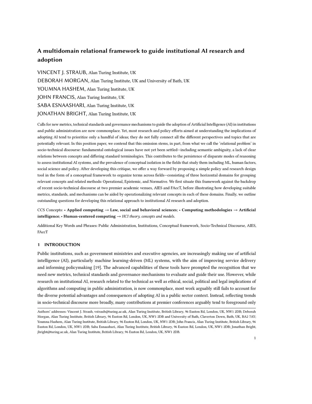 A multidomain relational framework to guide institutional AI research