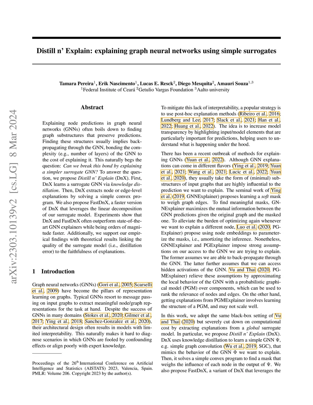 Explaining node predictions in graph neural networks (GNNs) often boils down to finding graph substructures that preserve predictions. Finding these structures usually implies back-propagating through the GNN, bonding the complexity (e.g., number of layers) of the GNN to the cost of explaining it. This naturally begs the question: Can we break this bond by explaining a simpler surrogate GNN? To answer the question, we propose Distill n' Explain (DnX). First, DnX learns a surrogate GNN via knowledge distillation. Then, DnX extracts node or edge-level explanations by solving a simple convex program. We also propose FastDnX, a faster version of DnX that leverages the linear decomposition of our surrogate model. Experiments show that DnX and FastDnX often outperform state-of-the-art GNN explainers while being orders of magnitude faster. Additionally, we support our empirical findings with theoretical results linking the quality of the surrogate model (i.e., distillation error) to the faithfulness of explanations.