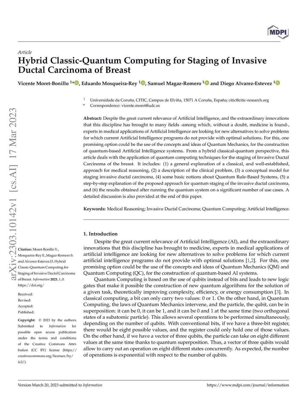Hybrid Classic-Quantum Computing for Staging of Invasive Ductal
