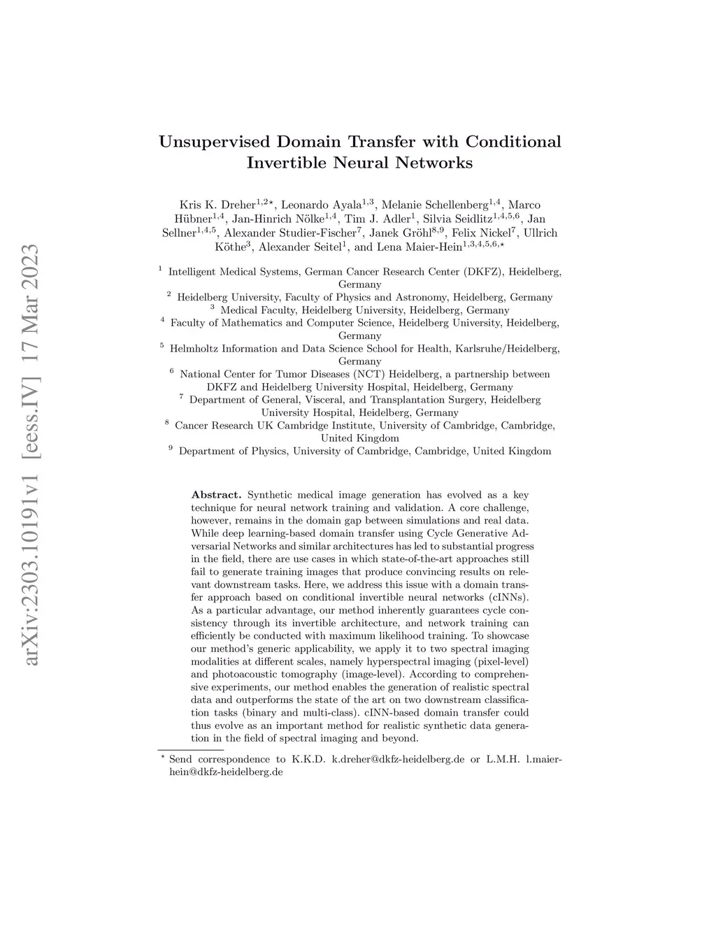Synthetic medical image generation has evolved as a key technique for neural network training and validation. A core challenge, however, remains in the domain gap between simulations and real data. While deep learning-based domain transfer using Cycle Generative Adversarial Networks and similar architectures has led to substantial progress in the field, there are use cases in which state-of-the-art approaches still fail to generate training images that produce convincing results on relevant downstream tasks. Here, we address this issue with a domain transfer approach based on conditional invertible neural networks (cINNs). As a particular advantage, our method inherently guarantees cycle consistency through its invertible architecture, and network training can efficiently be conducted with maximum likelihood training. To showcase our method's generic applicability, we apply it to two spectral imaging modalities at different scales, namely hyperspectral imaging (pixel-level) and photoacoustic tomography (image-level). According to comprehensive experiments, our method enables the generation of realistic spectral data and outperforms the state of the art on two downstream classification tasks (binary and multi-class). cINN-based domain transfer could thus evolve as an important method for realistic synthetic data generation in the field of spectral imaging and beyond.
