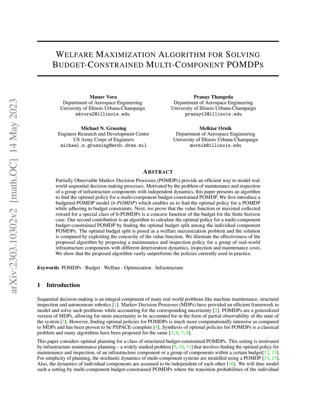 Partially Observable Markov Decision Processes (POMDPs) provide an efficient way to model real-world sequential decision making processes. Motivated by the problem of maintenance and inspection of a group of infrastructure components with independent dynamics, this paper presents an algorithm to find the optimal policy for a multi-component budget-constrained POMDP. We first introduce a budgeted-POMDP model (b-POMDP) which enables us to find the optimal policy for a POMDP while adhering to budget constraints. Next, we prove that the value function or maximal collected reward for a b-POMDP is a concave function of the budget for the finite horizon case. Our second contribution is an algorithm to calculate the optimal policy for a multi-component budget-constrained POMDP by finding the optimal budget split among the individual component POMDPs. The optimal budget split is posed as a welfare maximization problem and the solution is computed by exploiting the concave nature of the value function. We illustrate the effectiveness of the proposed algorithm by proposing a maintenance and inspection policy for a group of real-world infrastructure components with different deterioration dynamics, inspection and maintenance costs. We show that the proposed algorithm vastly outperforms the policy currently used in practice.