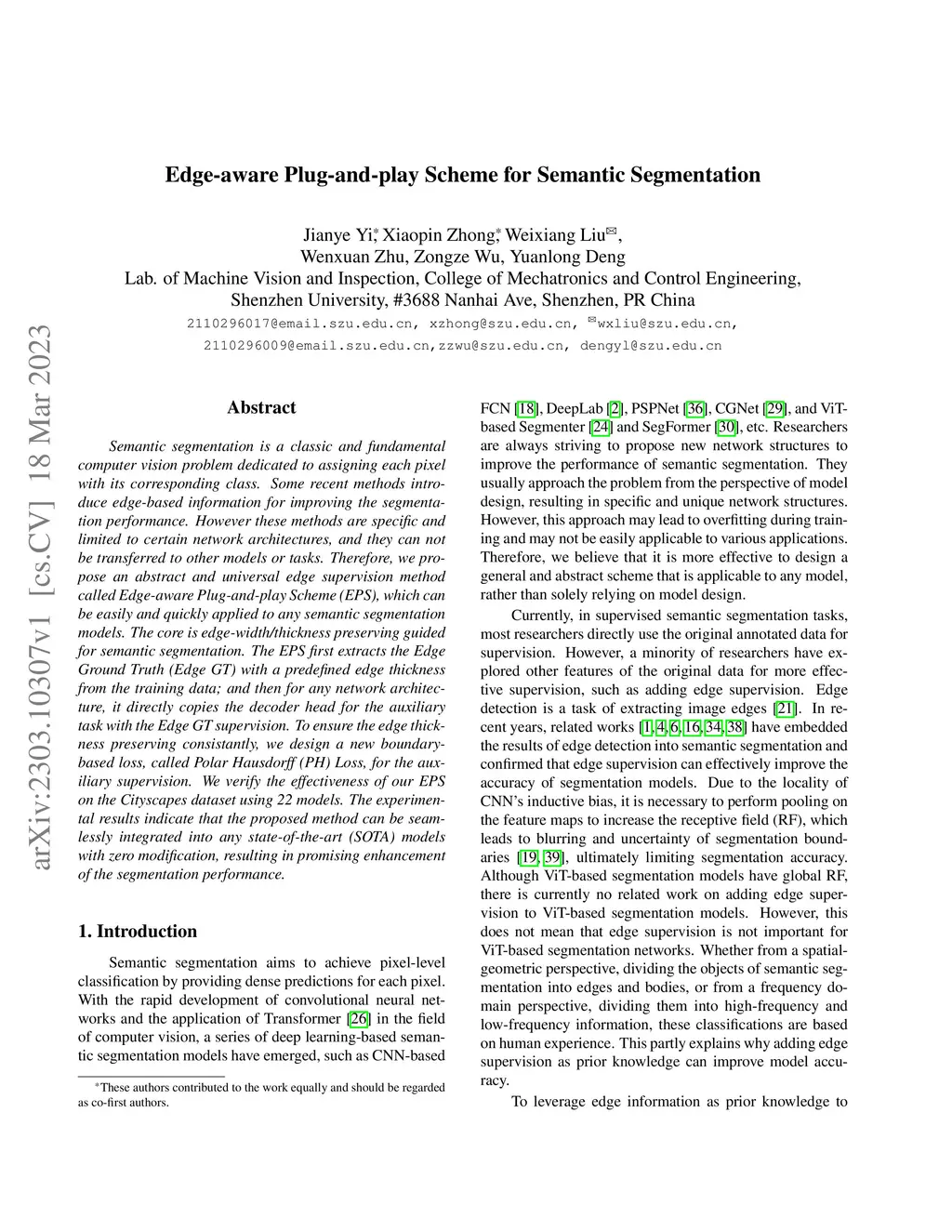 Semantic segmentation is a classic and fundamental computer vision problem dedicated to assigning each pixel with its corresponding class. Some recent methods introduce edge-based information for improving the segmentation performance. However these methods are specific and limited to certain network architectures, and they can not be transferred to other models or tasks. Therefore, we propose an abstract and universal edge supervision method called Edge-aware Plug-and-play Scheme (EPS), which can be easily and quickly applied to any semantic segmentation models. The core is edge-width/thickness preserving guided for semantic segmentation. The EPS first extracts the Edge Ground Truth (Edge GT) with a predefined edge thickness from the training data; and then for any network architecture, it directly copies the decoder head for the auxiliary task with the Edge GT supervision. To ensure the edge thickness preserving consistantly, we design a new boundarybased loss, called Polar Hausdorff (PH) Loss, for the auxiliary supervision. We verify the effectiveness of our EPS on the Cityscapes dataset using 22 models. The experimental results indicate that the proposed method can be seamlessly integrated into any state-of-the-art (SOTA) models with zero modification, resulting in promising enhancement of the segmentation performance.