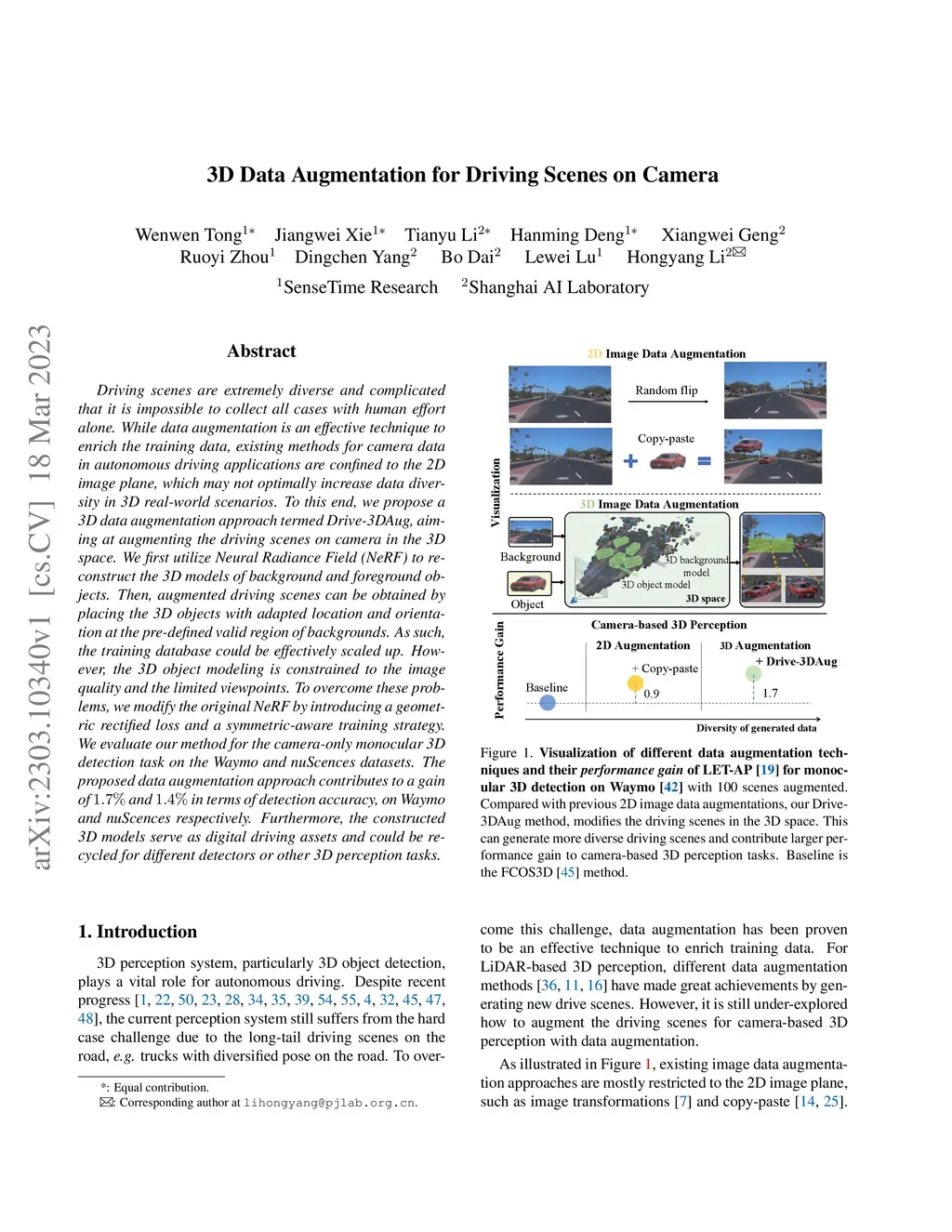Driving scenes are extremely diverse and complicated that it is impossible to collect all cases with human effort alone. While data augmentation is an effective technique to enrich the training data, existing methods for camera data in autonomous driving applications are confined to the 2D image plane, which may not optimally increase data diversity in 3D real-world scenarios. To this end, we propose a 3D data augmentation approach termed Drive-3DAug, aiming at augmenting the driving scenes on camera in the 3D space. We first utilize Neural Radiance Field (NeRF) to reconstruct the 3D models of background and foreground objects. Then, augmented driving scenes can be obtained by placing the 3D objects with adapted location and orientation at the pre-defined valid region of backgrounds. As such, the training database could be effectively scaled up. However, the 3D object modeling is constrained to the image quality and the limited viewpoints. To overcome these problems, we modify the original NeRF by introducing a geometric rectified loss and a symmetric-aware training strategy. We evaluate our method for the camera-only monocular 3D detection task on the Waymo and nuScences datasets. The proposed data augmentation approach contributes to a gain of 1.7% and 1.4% in terms of detection accuracy, on Waymo and nuScences respectively. Furthermore, the constructed 3D models serve as digital driving assets and could be recycled for different detectors or other 3D perception tasks.
