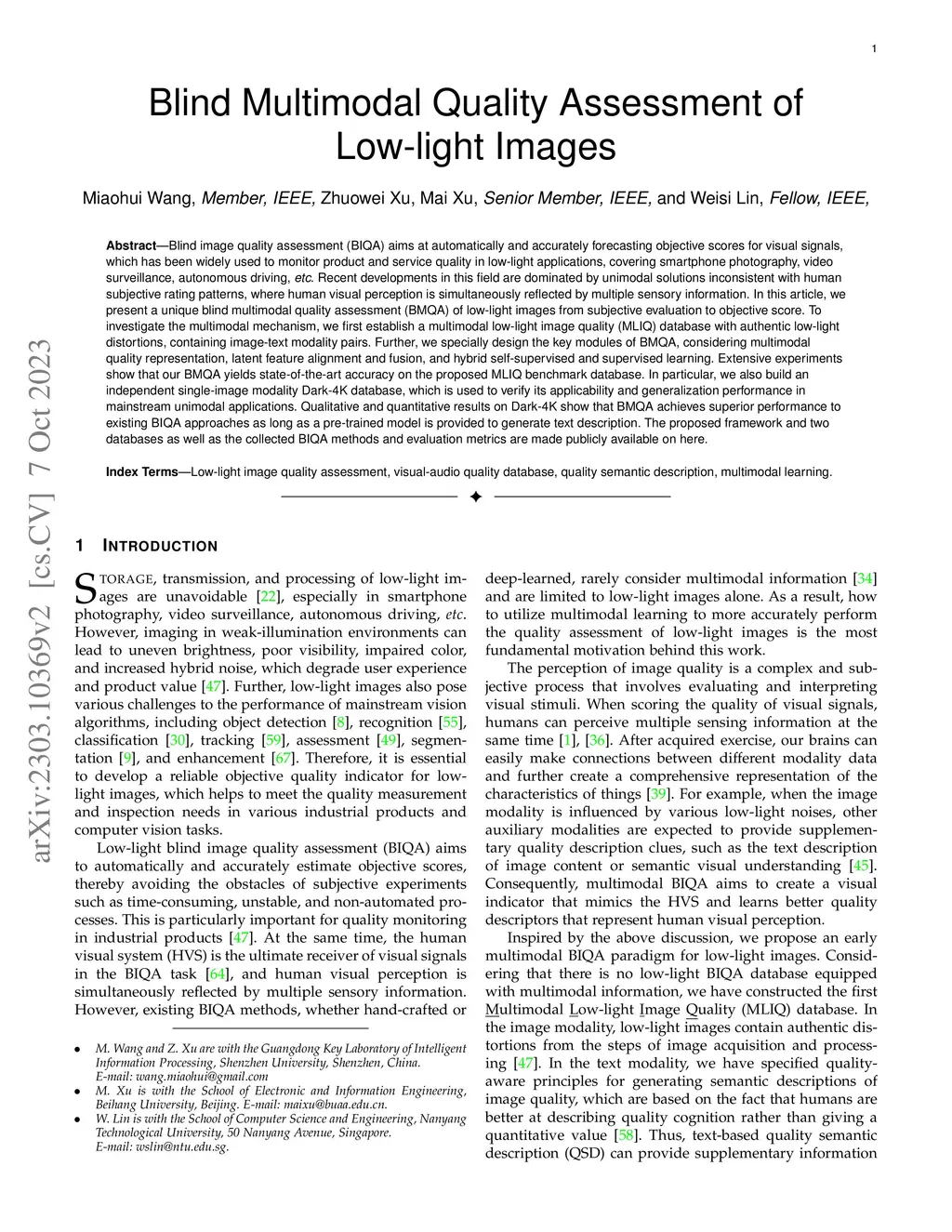 Blind image quality assessment (BIQA) aims at automatically and accurately forecasting objective scores for visual signals, which has been widely used to monitor product and service quality in low-light applications, covering smartphone photography, video surveillance, autonomous driving, etc. Recent developments in this field are dominated by unimodal solutions inconsistent with human subjective rating patterns, where human visual perception is simultaneously reflected by multiple sensory information. In this article, we present a unique blind multimodal quality assessment (BMQA) of low-light images from subjective evaluation to objective score. To investigate the multimodal mechanism, we first establish a multimodal low-light image quality (MLIQ) database with authentic low-light distortions, containing image-text modality pairs. Further, we specially design the key modules of BMQA, considering multimodal quality representation, latent feature alignment and fusion, and hybrid self-supervised and supervised learning. Extensive experiments show that our BMQA yields state-of-the-art accuracy on the proposed MLIQ benchmark database. In particular, we also build an independent single-image modality Dark-4K database, which is used to verify its applicability and generalization performance in mainstream unimodal applications. Qualitative and quantitative results on Dark-4K show that BMQA achieves superior performance to existing BIQA approaches as long as a pre-trained model is provided to generate text description. The proposed framework and two databases as well as the collected BIQA methods and evaluation metrics are made publicly available on here.
