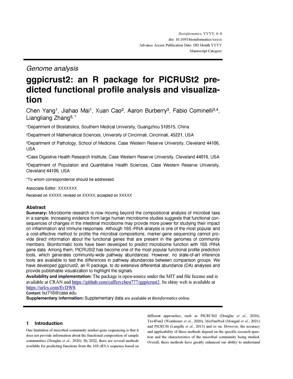 Microbiome research is now moving beyond the compositional analysis of microbial taxa in a sample. Increasing evidence from large human microbiome studies suggests that functional consequences of changes in the intestinal microbiome may provide more power for studying their impact on inflammation and immune responses. Although 16S rRNA analysis is one of the most popular and a cost-effective method to profile the microbial compositions, marker-gene sequencing cannot provide direct information about the functional genes that are present in the genomes of community members. Bioinformatic tools have been developed to predict microbiome function with 16S rRNA gene data. Among them, PICRUSt2 has become one of the most popular functional profile prediction tools, which generates community-wide pathway abundances. However, no state-of-art inference tools are available to test the differences in pathway abundances between comparison groups. We have developed ggpicrust2, an R package, to do extensive differential abundance(DA) analyses and provide publishable visualization to highlight the signals.