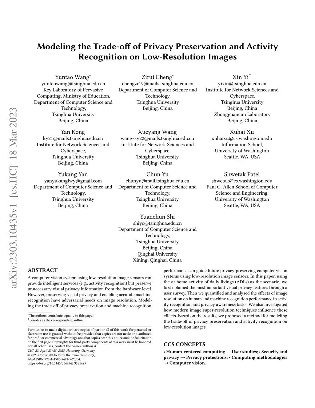 A computer vision system using low-resolution image sensors can provide intelligent services (e.g., activity recognition) but preserve unnecessary visual privacy information from the hardware level. However, preserving visual privacy and enabling accurate machine recognition have adversarial needs on image resolution. Modeling the trade-off of privacy preservation and machine recognition performance can guide future privacy-preserving computer vision systems using low-resolution image sensors. In this paper, using the at-home activity of daily livings (ADLs) as the scenario, we first obtained the most important visual privacy features through a user survey. Then we quantified and analyzed the effects of image resolution on human and machine recognition performance in activity recognition and privacy awareness tasks. We also investigated how modern image super-resolution techniques influence these effects. Based on the results, we proposed a method for modeling the trade-off of privacy preservation and activity recognition on low-resolution images.
