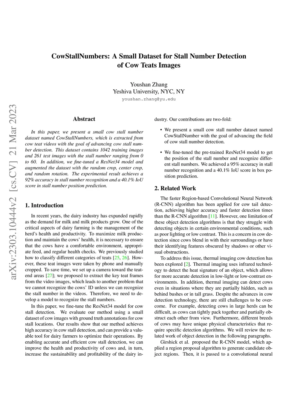 In this paper, we present a small cow stall number dataset named CowStallNumbers, which is extracted from cow teat videos with the goal of advancing cow stall number detection. This dataset contains 1042 training images and 261 test images with the stall number ranging from 0 to 60. In addition, we fine-tuned a ResNet34 model and augmented the dataset with the random crop, center crop, and random rotation. The experimental result achieves a 92% accuracy in stall number recognition and a 40.1% IoU score in stall number position prediction.