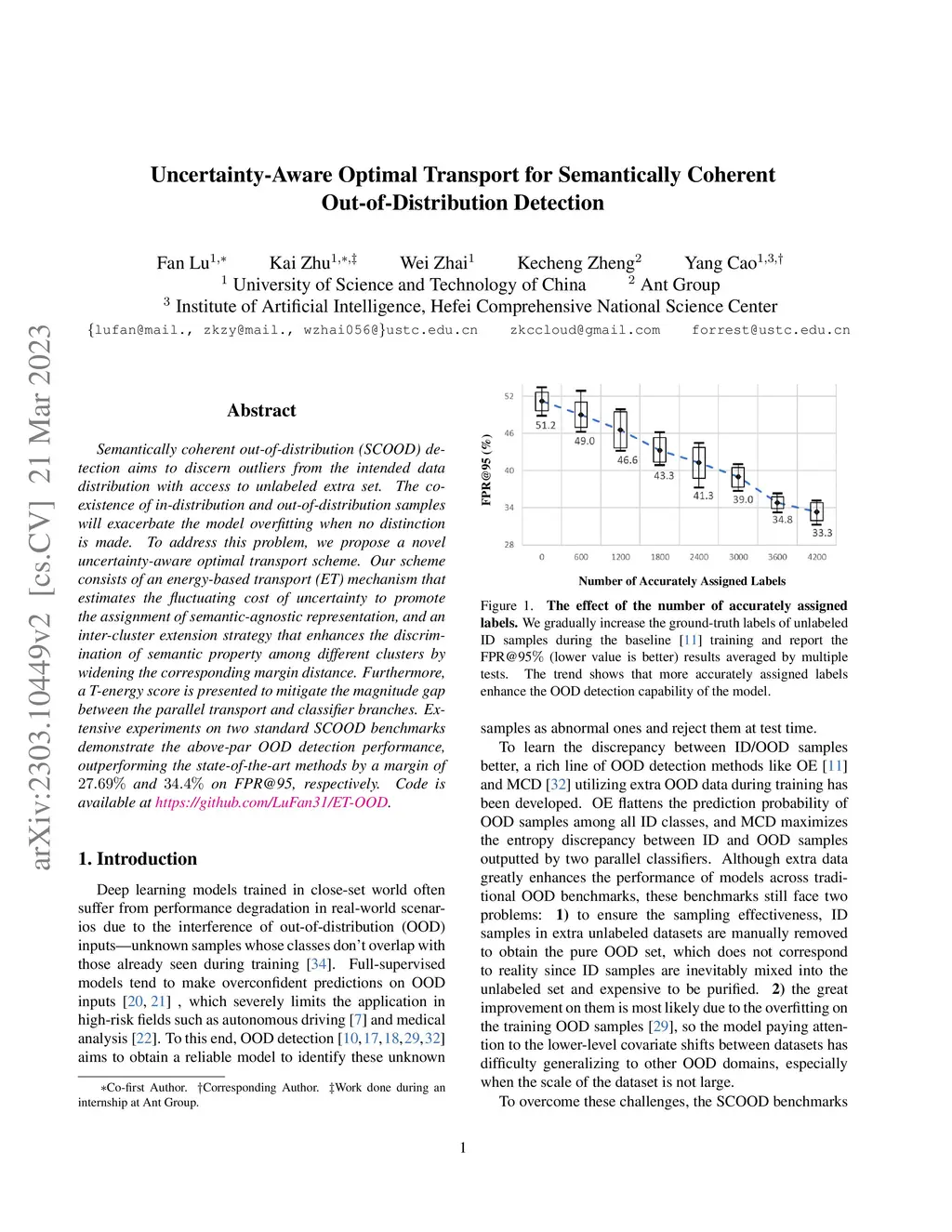 Semantically coherent out-of-distribution (SCOOD) detection aims to discern outliers from the intended data distribution with access to unlabeled extra set. The coexistence of in-distribution and out-of-distribution samples will exacerbate the model overfitting when no distinction is made. To address this problem, we propose a novel uncertainty-aware optimal transport scheme. Our scheme consists of an energy-based transport (ET) mechanism that estimates the fluctuating cost of uncertainty to promote the assignment of semantic-agnostic representation, and an inter-cluster extension strategy that enhances the discrimination of semantic property among different clusters by widening the corresponding margin distance. Furthermore, a T-energy score is presented to mitigate the magnitude gap between the parallel transport and classifier branches. Extensive experiments on two standard SCOOD benchmarks demonstrate the above-par OOD detection performance, outperforming the state-of-the-art methods by a margin of 27.69% and 34.4% on FPR@95, respectively.
