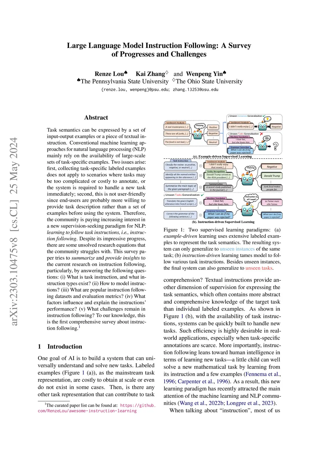 Task semantics can be expressed by a set of input-output examples or a piece of textual instruction. Conventional machine learning approaches for natural language processing (NLP) mainly rely on the availability of large-scale sets of task-specific examples. Two issues arise: first, collecting task-specific labeled examples does not apply to scenarios where tasks may be too complicated or costly to annotate, or the system is required to handle a new task immediately; second, this is not user-friendly since end-users are probably more willing to provide task description rather than a set of examples before using the system. Therefore, the community is paying increasing interest in a new supervision-seeking paradigm for NLP: learning to follow task instructions, i.e., instruction following. Despite its impressive progress, there are some common issues that the community struggles with. This survey paper tries to summarize and provide insights to the current research on instruction following, particularly, by answering the following questions: (i) What is task instruction, and what instruction types exist? (ii) How to model instructions? (iii) What are popular instruction following datasets and evaluation metrics? (iv) What factors influence and explain the instructions' performance? (v) What challenges remain in instruction following? To our knowledge, this is the first comprehensive survey about instruction following.