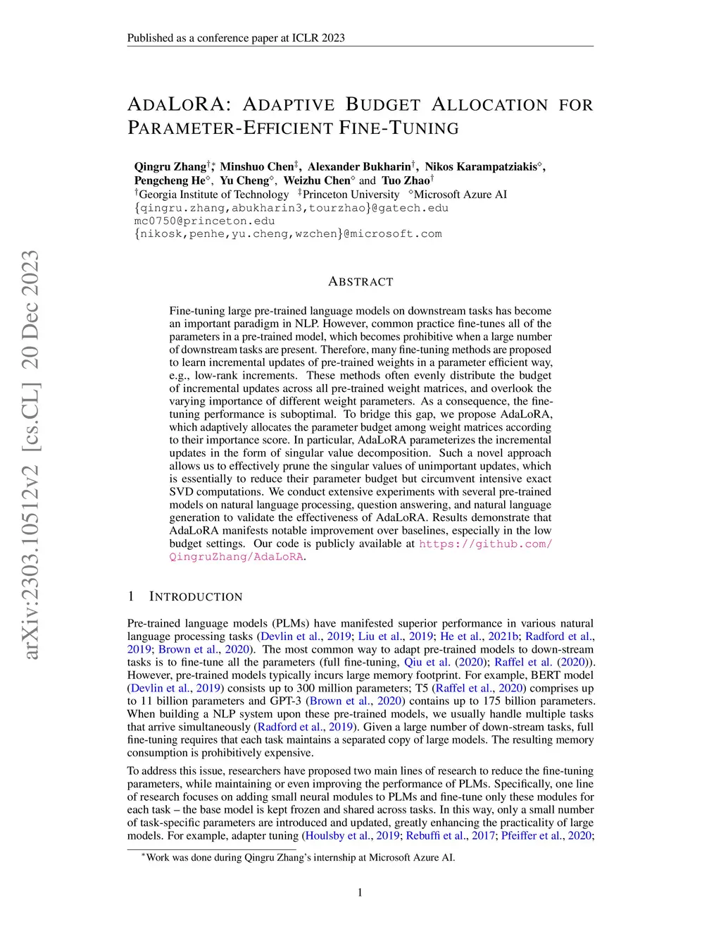 AdaLoRA: Adaptive Budget Allocation for Parameter-Efficient Fine-Tuning