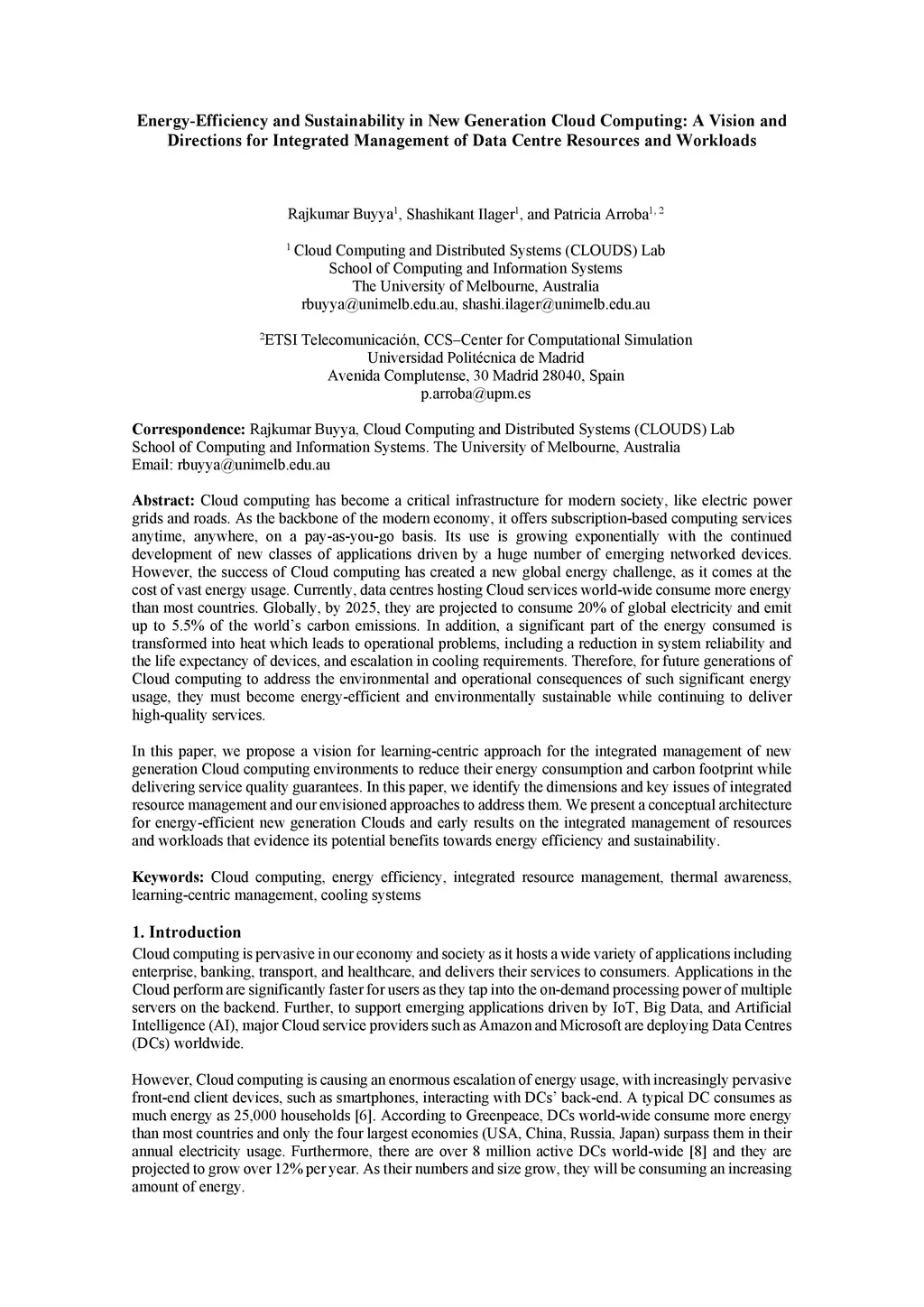 Cloud computing has become a critical infrastructure for modern society, like electric power grids and roads. As the backbone of the modern economy, it offers subscription-based computing services anytime, anywhere, on a pay-as-you-go basis. Its use is growing exponentially with the continued development of new classes of applications driven by a huge number of emerging networked devices. However, the success of Cloud computing has created a new global energy challenge, as it comes at the cost of vast energy usage. Currently, data centres hosting Cloud services world-wide consume more energy than most countries. Globally, by 2025, they are projected to consume 20% of global electricity and emit up to 5.5% of the world's carbon emissions. In addition, a significant part of the energy consumed is transformed into heat which leads to operational problems, including a reduction in system reliability and the life expectancy of devices, and escalation in cooling requirements. Therefore, for future generations of Cloud computing to address the environmental and operational consequences of such significant energy usage, they must become energy-efficient and environmentally sustainable while continuing to deliver high-quality services. In this paper, we propose a vision for learning-centric approach for the integrated management of new generation Cloud computing environments to reduce their energy consumption and carbon footprint while delivering service quality guarantees. In this paper, we identify the dimensions and key issues of integrated resource management and our envisioned approaches to address them. We present a conceptual architecture for energy-efficient new generation Clouds and early results on the integrated management of resources and workloads that evidence its potential benefits towards energy efficiency and sustainability.