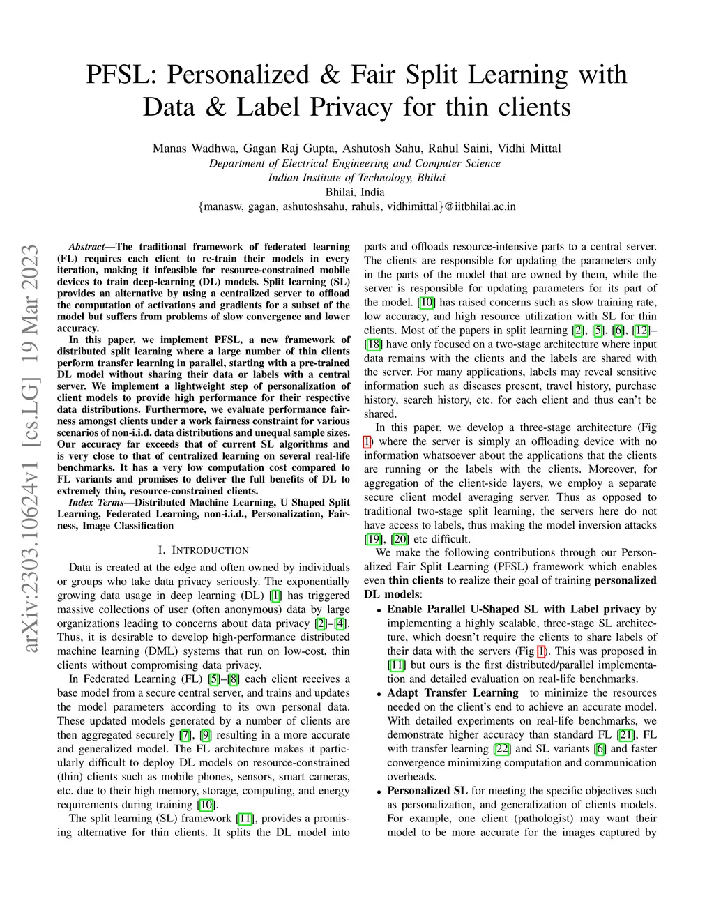 The traditional framework of federated learning (FL) requires each client to re-train their models in every iteration, making it infeasible for resource-constrained mobile devices to train deep-learning (DL) models. Split learning (SL) provides an alternative by using a centralized server to offload the computation of activations and gradients for a subset of the model but suffers from problems of slow convergence and lower accuracy. In this paper, we implement PFSL, a new framework of distributed split learning where a large number of thin clients perform transfer learning in parallel, starting with a pre-trained DL model without sharing their data or labels with a central server. We implement a lightweight step of personalization of client models to provide high performance for their respective data distributions. Furthermore, we evaluate performance fairness amongst clients under a work fairness constraint for various scenarios of non-i.i.d. data distributions and unequal sample sizes. Our accuracy far exceeds that of current SL algorithms and is very close to that of centralized learning on several real-life benchmarks. It has a very low computation cost compared to FL variants and promises to deliver the full benefits of DL to extremely thin, resource-constrained clients.