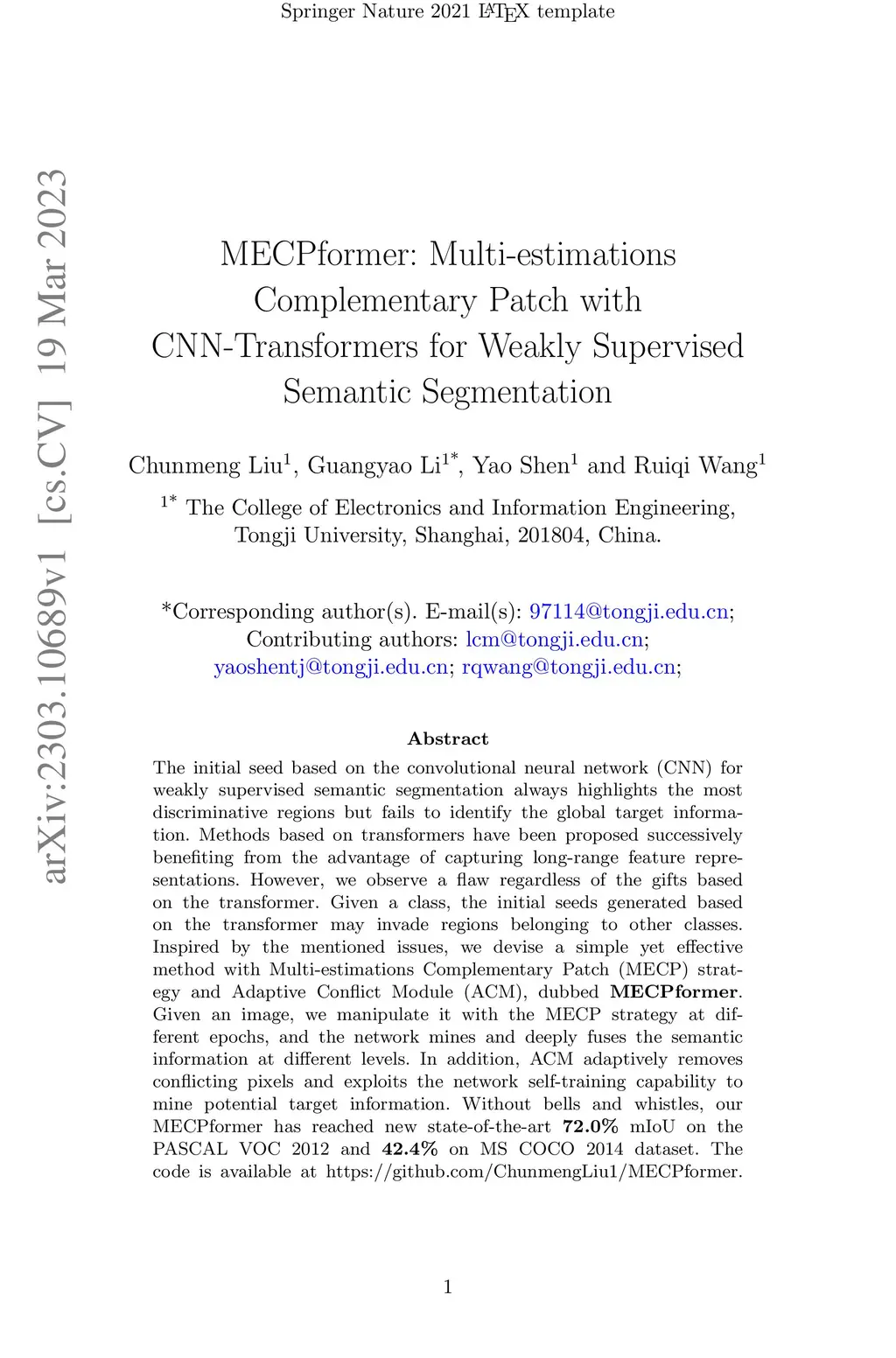 The initial seed based on the convolutional neural network (CNN) for weakly supervised semantic segmentation always highlights the most discriminative regions but fails to identify the global target information. Methods based on transformers have been proposed successively benefiting from the advantage of capturing long-range feature representations. However, we observe a flaw regardless of the gifts based on the transformer. Given a class, the initial seeds generated based on the transformer may invade regions belonging to other classes. Inspired by the mentioned issues, we devise a simple yet effective method with Multi-estimations Complementary Patch (MECP) strategy and Adaptive Conflict Module (ACM), dubbed MECPformer. Given an image, we manipulate it with the MECP strategy at different epochs, and the network mines and deeply fuses the semantic information at different levels. In addition, ACM adaptively removes conflicting pixels and exploits the network self-training capability to mine potential target information. Without bells and whistles, our MECPformer has reached new state-of-the-art 72.0% mIoU on the PASCAL VOC 2012 and 42.4% on MS COCO 2014 dataset. The code is available at https://github.com/ChunmengLiu1/MECPformer.