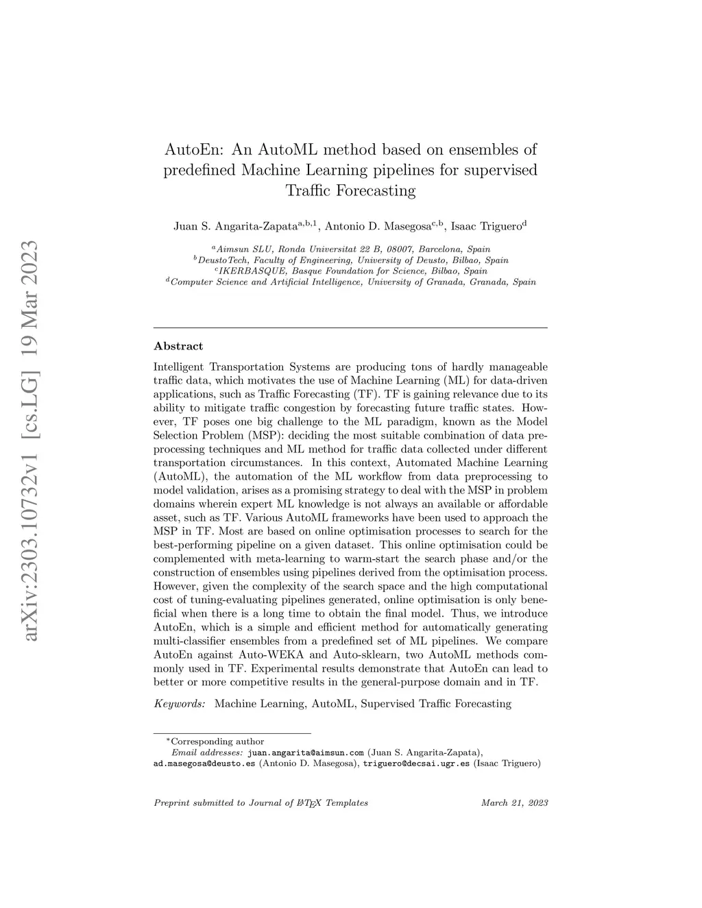 Intelligent Transportation Systems are producing tons of hardly manageable traffic data, which motivates the use of Machine Learning (ML) for data-driven applications, such as Traffic Forecasting (TF). TF is gaining relevance due to its ability to mitigate traffic congestion by forecasting future traffic states. However, TF poses one big challenge to the ML paradigm, known as the Model Selection Problem (MSP): deciding the most suitable combination of data preprocessing techniques and ML method for traffic data collected under different transportation circumstances. In this context, Automated Machine Learning (AutoML), the automation of the ML workflow from data preprocessing to model validation, arises as a promising strategy to deal with the MSP in problem domains wherein expert ML knowledge is not always an available or affordable asset, such as TF. Various AutoML frameworks have been used to approach the MSP in TF. Most are based on online optimisation processes to search for the best-performing pipeline on a given dataset. This online optimisation could be complemented with meta-learning to warm-start the search phase and/or the construction of ensembles using pipelines derived from the optimisation process. However, given the complexity of the search space and the high computational cost of tuning-evaluating pipelines generated, online optimisation is only beneficial when there is a long time to obtain the final model. Thus, we introduce AutoEn, which is a simple and efficient method for automatically generating multi-classifier ensembles from a predefined set of ML pipelines. We compare AutoEn against Auto-WEKA and Auto-sklearn, two AutoML methods commonly used in TF. Experimental results demonstrate that AutoEn can lead to better or more competitive results in the general-purpose domain and in TF.