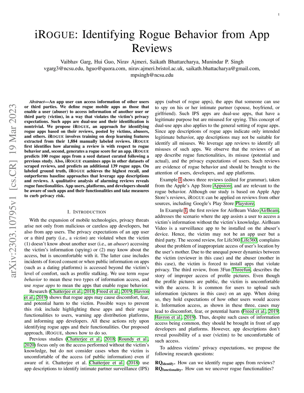 An app user can access information of other users or third parties. We define rogue mobile apps as those that enable a user (abuser) to access information of another user or third party (victim), in a way that violates the victim's privacy expectations. Such apps are dual-use and their identification is nontrivial. We propose iRogue, an approach for identifying rogue apps based on their reviews, posted by victims, abusers, and others. iRogue involves training on deep learning features extracted from their 1,884 manually labeled reviews. iRogue first identifies how alarming a review is with respect to rogue behavior and, second, generates a rogue score for an app. iRogue predicts 100 rogue apps from a seed dataset curated following a previous study. Also, iRogue examines apps in other datasets of scraped reviews, and predicts an additional 139 rogue apps. On labeled ground truth, iRogue achieves the highest recall, and outperforms baseline approaches that leverage app descriptions and reviews. A qualitative analysis of alarming reviews reveals rogue functionalities. App users, platforms, and developers should be aware of such apps and their functionalities and take measures to curb privacy risk.